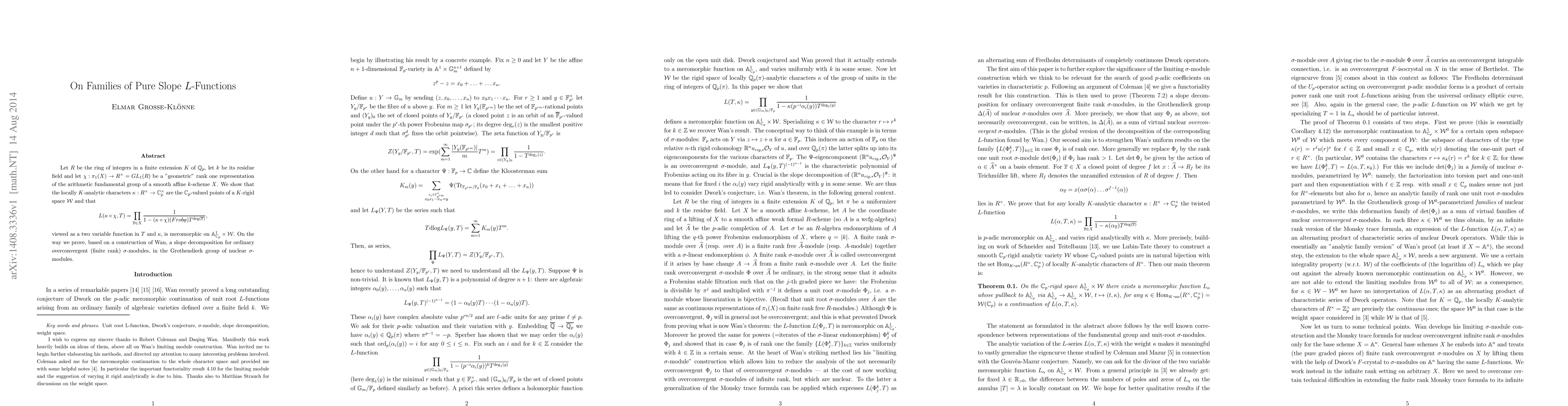 Let $R$ be the ring of integers in a finite extension $K$ of $\mathbb{Q}_p$, let $k$ be its residue field and let $\chi:\pi_1(X)\to R^{\times}=GL_{1}(R)$ be a "geometric" rank one representation of the arithmetic fundamental group of a smooth affine $k$-scheme $X$. We show that the locally $K$-analytic characters $\kappa:R^{\times}\to\mathbb{C}_p^{\times}$ are the $\mathbb{C}_p$-valued points of a $K$-rigid space ${\cal W}$ and that $$L(\kappa\circ\chi,T)=\prod_{\overline{x}\in X}\frac{1}{1-(\kappa \circ\chi)(Frob_{\overline{x}})T^{\deg(\overline{x})}},$$viewed as a two variable function in $T$ and $\kappa$, is meromorphic on $\mathbb{A}_{\mathbb{C}_p}^1\times{\cal W}$. On the way we prove, based on a construction of Wan, a slope decomposition for ordinary overconvergent (finite rank) $\sigma$-modules, in the Grothendieck group of nuclear $\sigma$-modules.