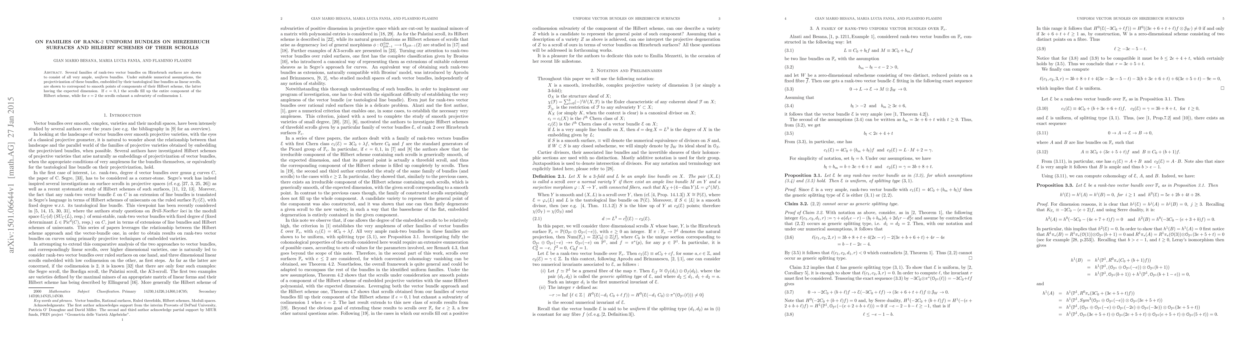 This paper explores families of rank-2 uniform bundles on Hirzebruch surfaces and demonstrates that they consist entirely of very ample bundles. It further shows that these bundles, when embedded as linear scrolls, correspond to smooth points in the Hilbert scheme under specific numerical conditions.