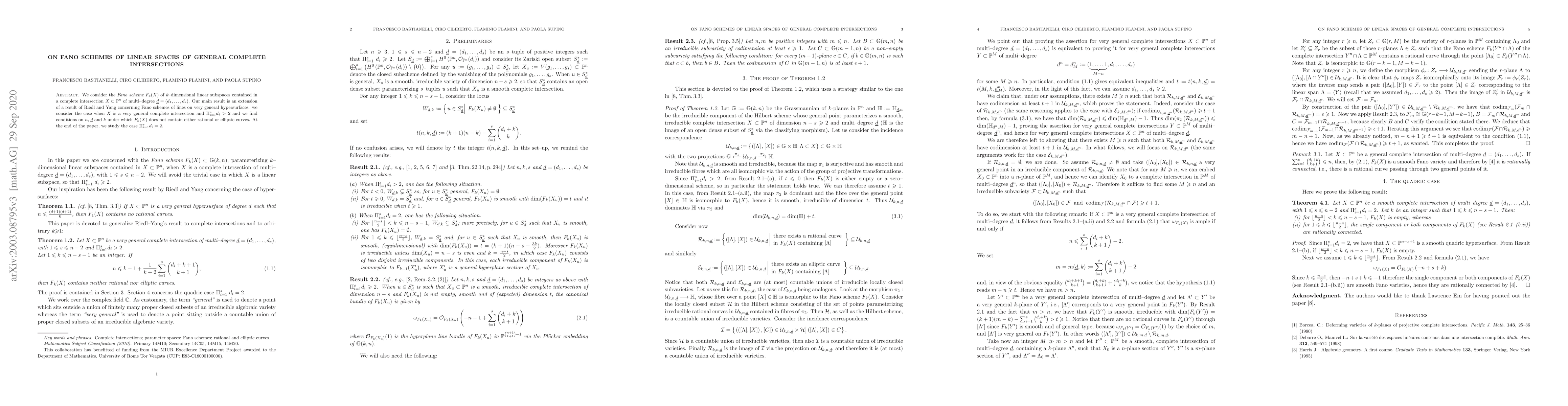 We consider the Fano scheme $F_k(X)$ of $k$--dimensional linear subspaces contained in a complete intersection $X \subset \mathbb{P}^n$ of multi--degree $\underline{d} = (d_1, \ldots, d_s)$. Our main result is an extension of a result of Riedl and Yang concerning Fano schemes of lines on very general hypersurfaces: we consider the case when $X$ is a very general complete intersection and $\Pi_{i=1}^s d_i > 2$ and we find conditions on $n$, $\underline{d}$ and $k$ under which $F_k(X)$ does not contain either rational or elliptic curves. At the end of the paper, we study the case $\Pi_{i=1}^s d_i = 2$.