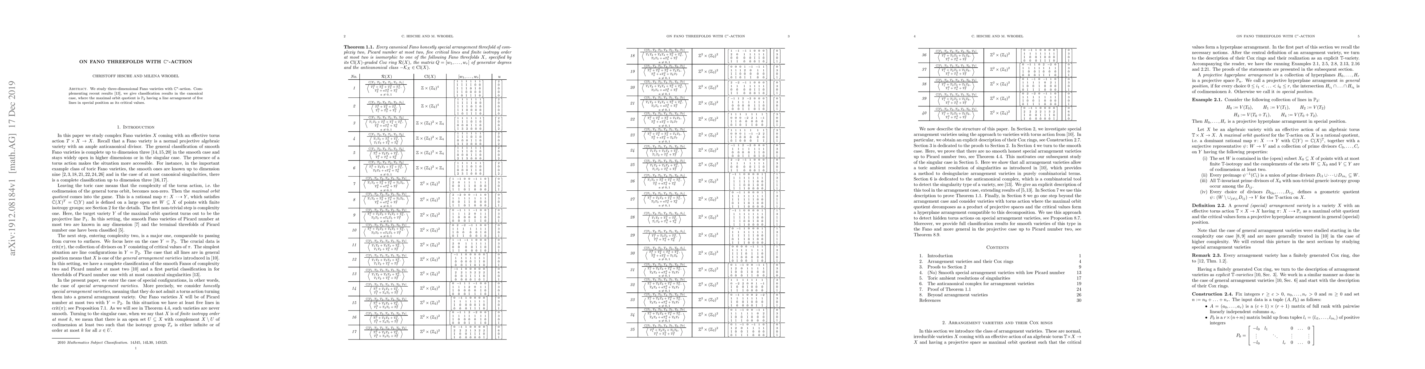 We study three-dimensional Fano varieties with $\mathbb{C}^*$-action. Complementing recent results [13], we give classification results in the canonical case, where the maximal orbit quotient is $\mathbb{P}_2$ having a line arrangement of five lines in special position as its critical values.