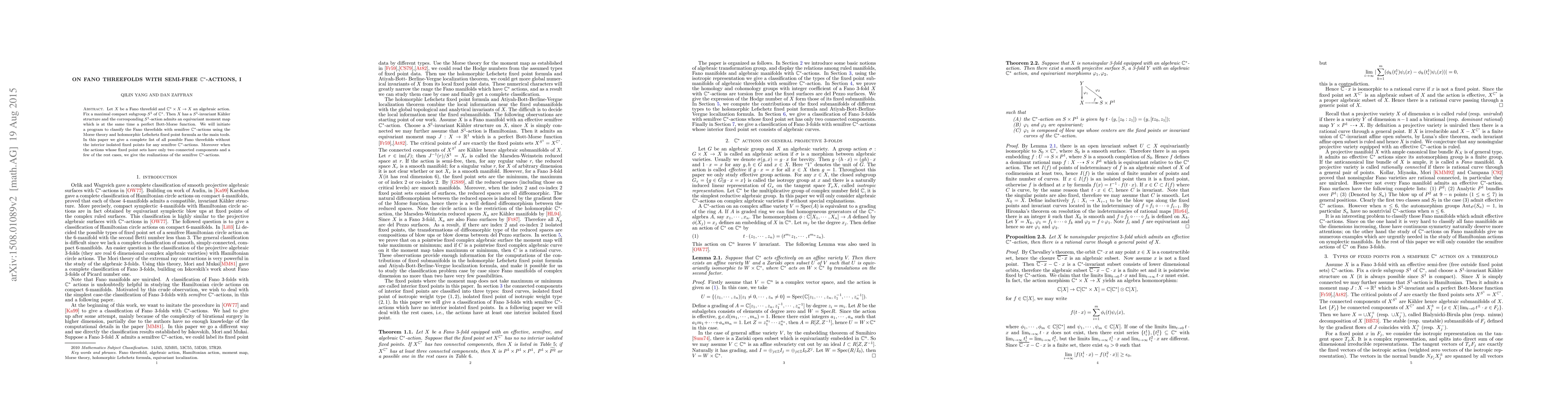 This paper investigates Fano threefolds equipped with semi-free $\mathbb{C}^*$-actions, proving the existence of $S^1$-invariant Kähler structures and classifying those without "interior isolated fixed points." It initiates a program using Morse theory and the holomorphic Lefschetz fixed point formula to identify realizations of such actions when fixed point sets have two connected components.