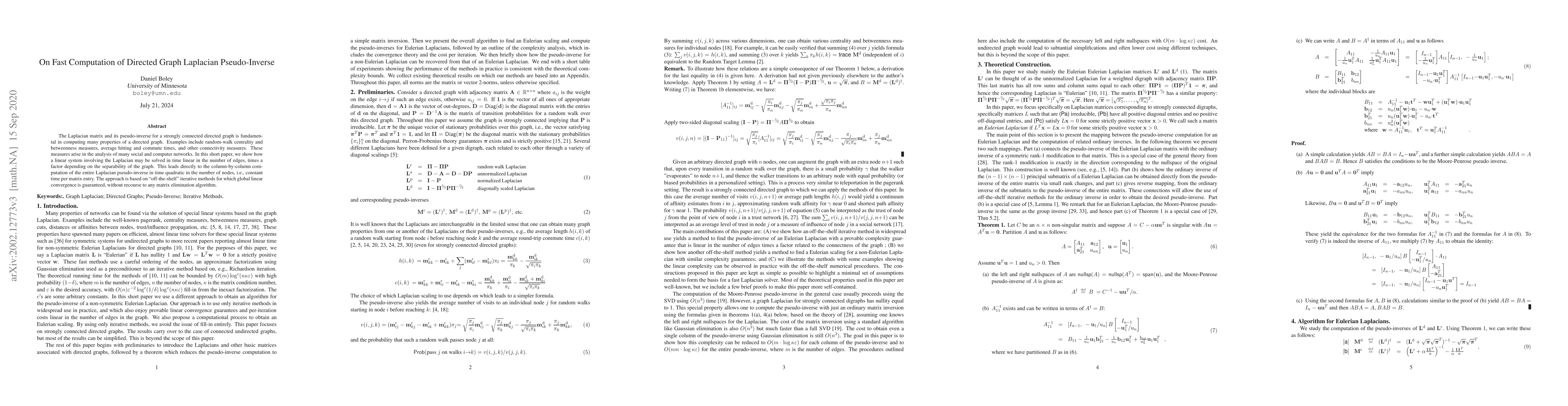 The Laplacian matrix and its pseudo-inverse for a strongly connected directed graph is fundamental in computing many properties of a directed graph. Examples include random-walk centrality and betweenness measures, average hitting and commute times, and other connectivity measures. These measures arise in the analysis of many social and computer networks. In this short paper, we show how a linear system involving the Laplacian may be solved in time linear in the number of edges, times a factor depending on the separability of the graph. This leads directly to the column-by-column computation of the entire Laplacian pseudo-inverse in time quadratic in the number of nodes, i.e., constant time per matrix entry. The approach is based on "off-the-shelf" iterative methods for which global linear convergence is guaranteed, without recourse to any matrix elimination algorithm.