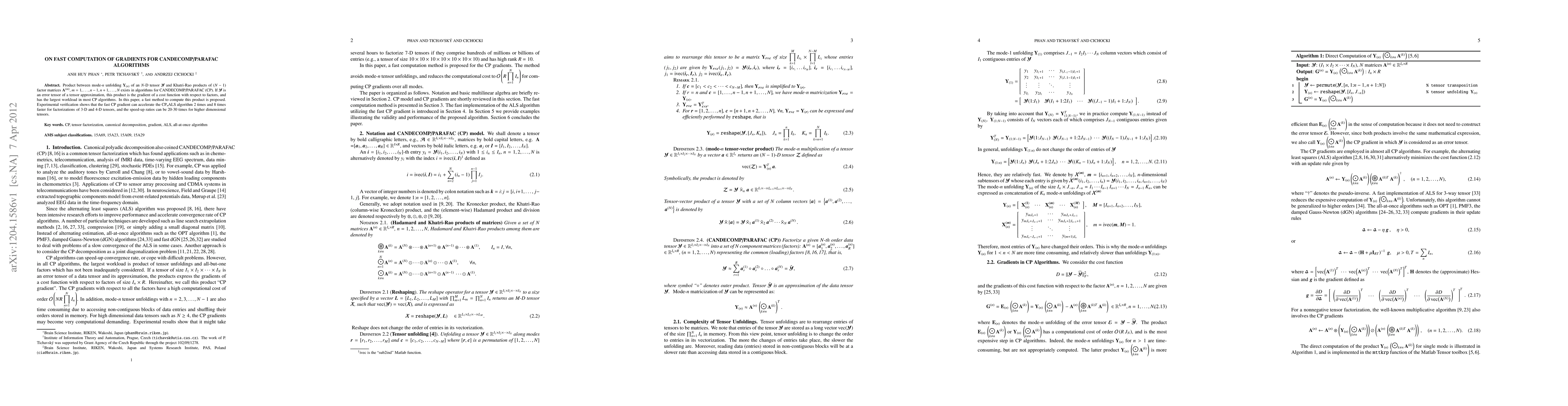 This paper proposes a fast computation method for the gradient in CANDECOMP/PARAFAC (CP) algorithms, significantly reducing the workload associated with the product of mode-$n$ unfolding and Khatri-Rao products. Experimental results show a speed-up of 2-8 times for 3-D and 4-D tensors, and up to 20-30 times for higher dimensional tensors.