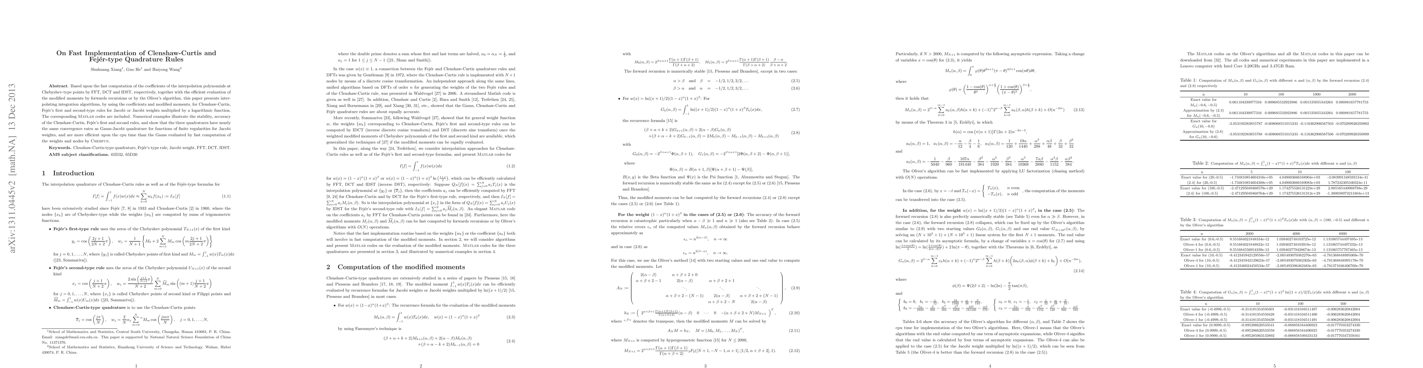 This paper introduces fast implementation methods for Clenshaw-Curtis and Fejér-type quadrature rules using FFT, DCT, and IDST for coefficient computation and efficient evaluation techniques. The algorithms demonstrate comparable convergence rates and superior CPU efficiency compared to Gauss-Jacobi quadrature.