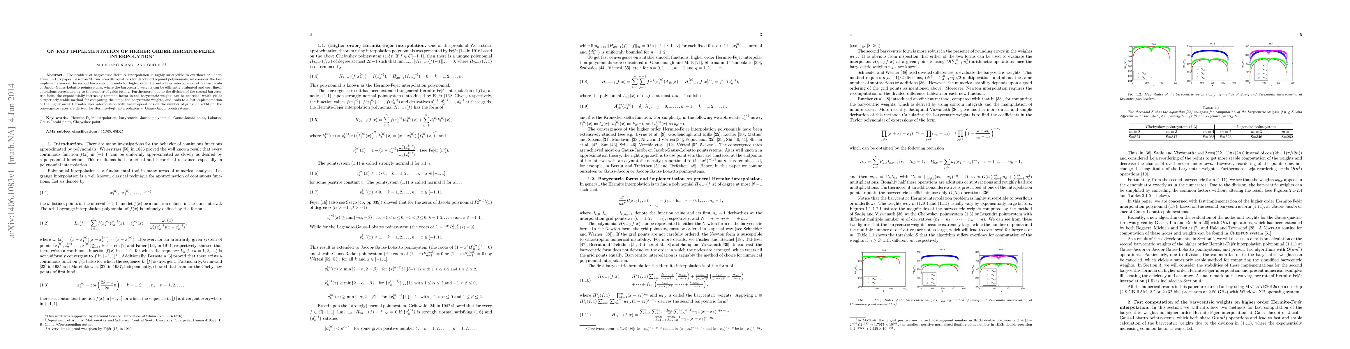 The paper proposes a fast implementation method for higher-order Hermite-Fejer interpolation using Sturm-Liouville equations for Jacobi orthogonal polynomials, focusing on the second barycentric formula at Gauss-Jacobi or Jacobi-Gauss-Lobatto point systems.