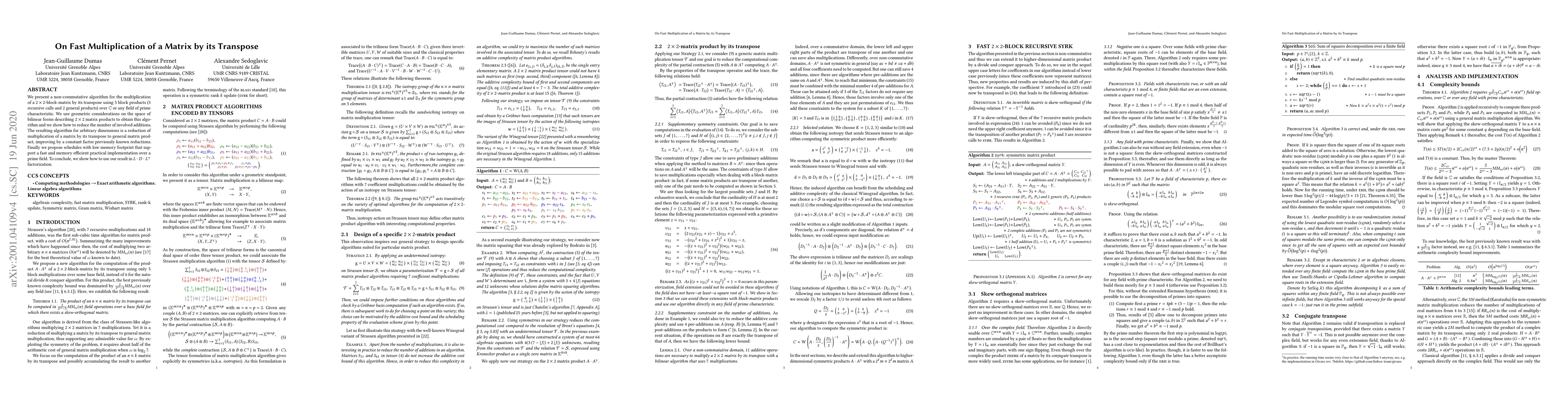 This paper introduces a non-commutative algorithm to multiply a 2x2-block-matrix by its transpose using 5 block products, reducing the computational complexity. The method leverages geometric insights and proposes efficient schedules for practical implementation over finite fields, with applications in LDLT factorization.