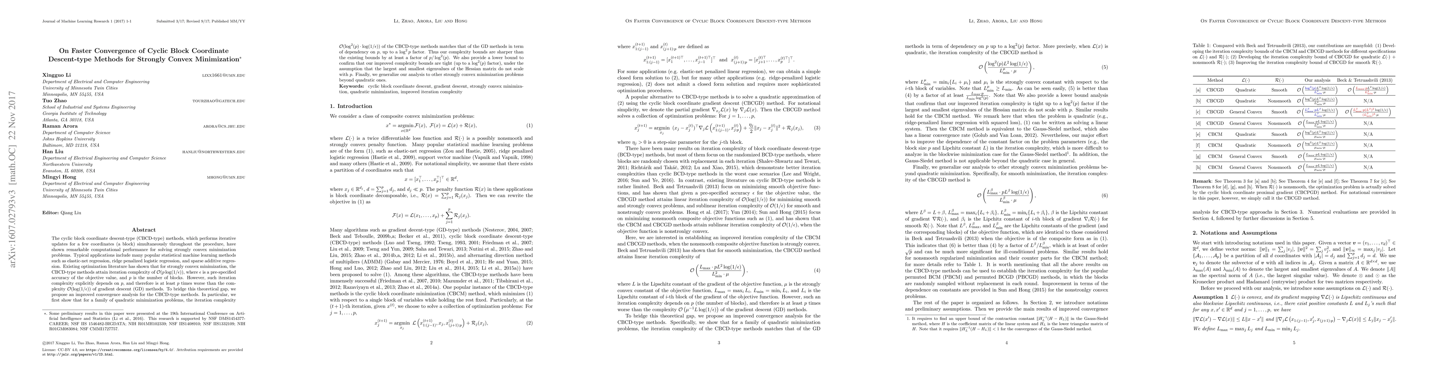This paper proposes an improved convergence analysis for cyclic block coordinate descent-type (CBCD-type) methods, showing that their iteration complexity matches that of gradient descent methods for strongly convex minimization problems, up to a $\log^2 p$ factor. The authors provide tighter complexity bounds and confirm their tightness through a lower bound analysis.