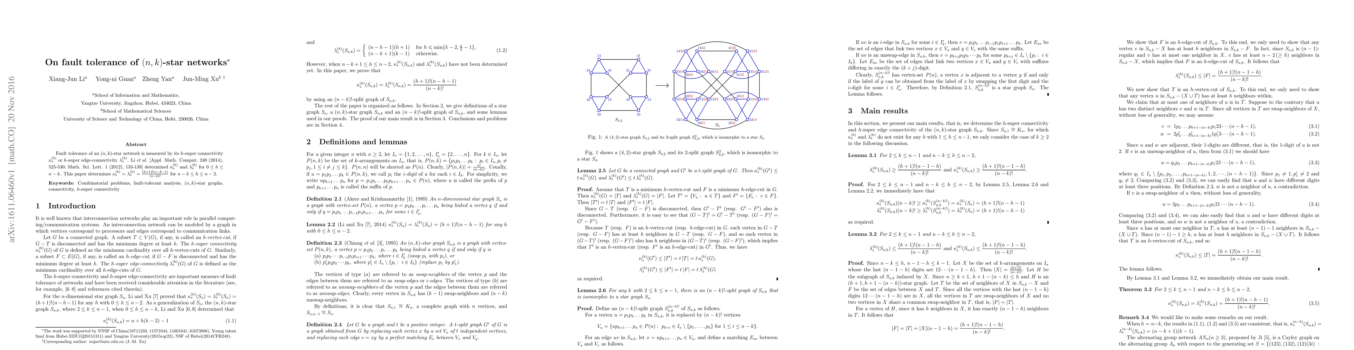 Fault tolerance of an $(n,k)$-star network is measured by its $h$-super connectivity $\kappa_s^{(h)}$ or $h$-super edge-connectivity $\lambda_s^{(h)}$. Li {\it et al.} [Appl. Math. Comput. 248 (2014), 525-530; Math. Sci. Lett. 1 (2012), 133-138] determined $\kappa_s^{(h)}$ and $\lambda_s^{(h)}$ for $0\leq h\leq n-k$. This paper determines $\kappa_s^{(h)}=\lambda_s^{(h)}=\frac{(h+1)!(n-h-1)}{(n-k)!}$ for $n-k\leq h \leq n-2$.