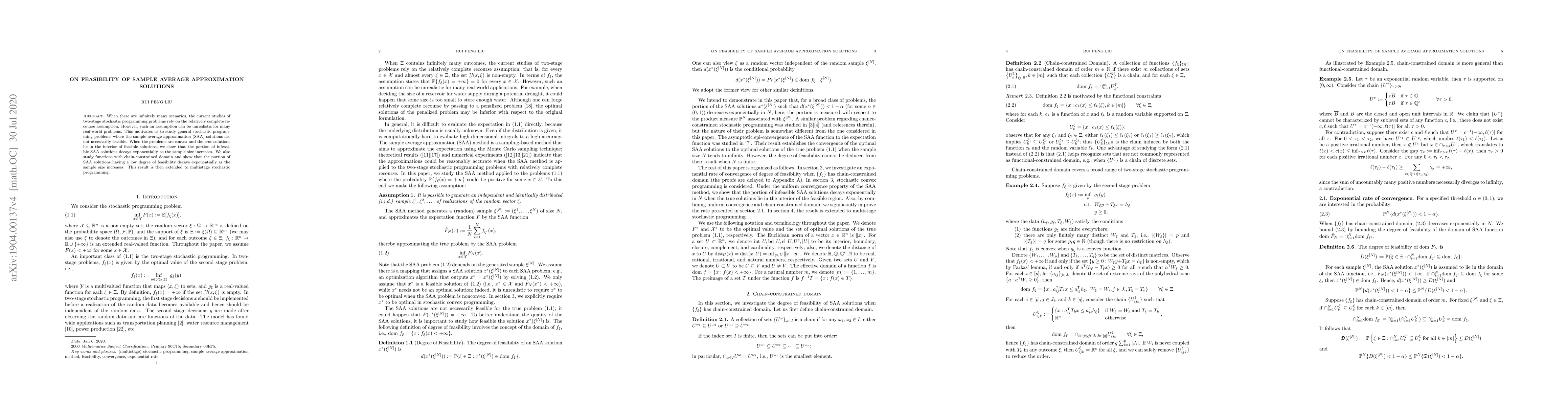 When there are infinitely many scenarios, the current studies of two-stage stochastic programming problems rely on the relatively complete recourse assumption. However, such assumption can be unrealistic for many real-world problems. This motivates us to study general stochastic programming problems where the sample average approximation (SAA) solutions are not necessarily feasible. When the problems are convex and the true solutions lie in the interior of feasible solutions, we show the portion of infeasible SAA solutions decays exponentially as the sample size increases. We also study functions with chain-constrained domain, and show the portion of SAA solutions having a low degree of feasibility decays exponentially as the sample size increases. This result is then extended to multistage stochastic programming.