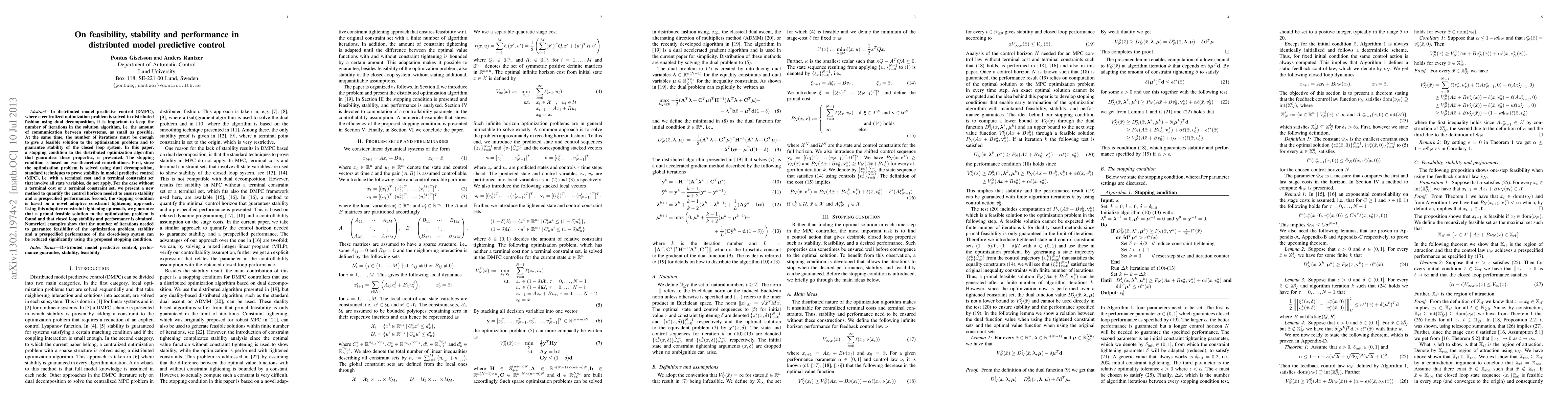 In distributed model predictive control (DMPC), where a centralized optimization problem is solved in distributed fashion using dual decomposition, it is important to keep the number of iterations in the solution algorithm, i.e. the amount of communication between subsystems, as small as possible. At the same time, the number of iterations must be enough to give a feasible solution to the optimization problem and to guarantee stability of the closed loop system. In this paper, a stopping condition to the distributed optimization algorithm that guarantees these properties, is presented. The stopping condition is based on two theoretical contributions. First, since the optimization problem is solved using dual decomposition, standard techniques to prove stability in model predictive control (MPC), i.e. with a terminal cost and a terminal constraint set that involve all state variables, do not apply. For the case without a terminal cost or a terminal constraint set, we present a new method to quantify the control horizon needed to ensure stability and a prespecified performance. Second, the stopping condition is based on a novel adaptive constraint tightening approach. Using this adaptive constraint tightening approach, we guarantee that a primal feasible solution to the optimization problem is found and that closed loop stability and performance is obtained. Numerical examples show that the number of iterations needed to guarantee feasibility of the optimization problem, stability and a prespecified performance of the closed-loop system can be reduced significantly using the proposed stopping condition.