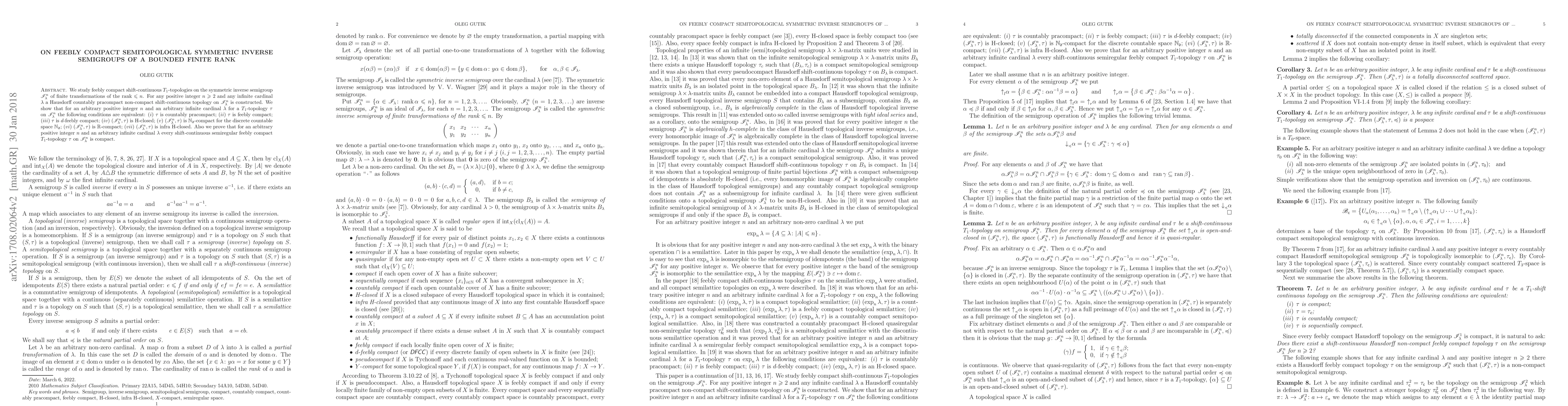 We study feebly compact shift-continuous $T_1$-topologies on the symmetric inverse semigroup $\mathscr{I}_\lambda^n$ of finite transformations of the rank $\leqslant n$. For any positive integer $n\geqslant2$ and any infinite cardinal $\lambda$ a Hausdorff countably pracompact non-compact shift-continuous topology on $\mathscr{I}_\lambda^n$ is constructed. We show that for an arbitrary positive integer $n$ and an arbitrary infinite cardinal $\lambda$ for a $T_1$-topology $\tau$ on $\mathscr{I}_\lambda^n$ the following conditions are equivalent: $(i)$ $\tau$ is countably pracompact; $(ii)$ $\tau$ is feebly compact; $(iii)$ $\tau$ is $d$-feebly compact; $(iv)$ $\left(\mathscr{I}_\lambda^n,\tau\right)$ is H-closed; $(v)$ $\left(\mathscr{I}_\lambda^n,\tau\right)$ is $\mathbb{N}_{\mathfrak{d}}$-compact for the discrete countable space $\mathbb{N}_{\mathfrak{d}}$; $(vi)$ $\left(\mathscr{I}_\lambda^n,\tau\right)$ is $\mathbb{R}$-compact; $(vii)$ $\left(\mathscr{I}_\lambda^n,\tau\right)$ is infra H-closed. Also we prove that for an arbitrary positive integer $n$ and an arbitrary infinite cardinal $\lambda$ every shift-continuous semiregular feebly compact $T_1$-topology $\tau$ on $\mathscr{I}_\lambda^n$ is compact.