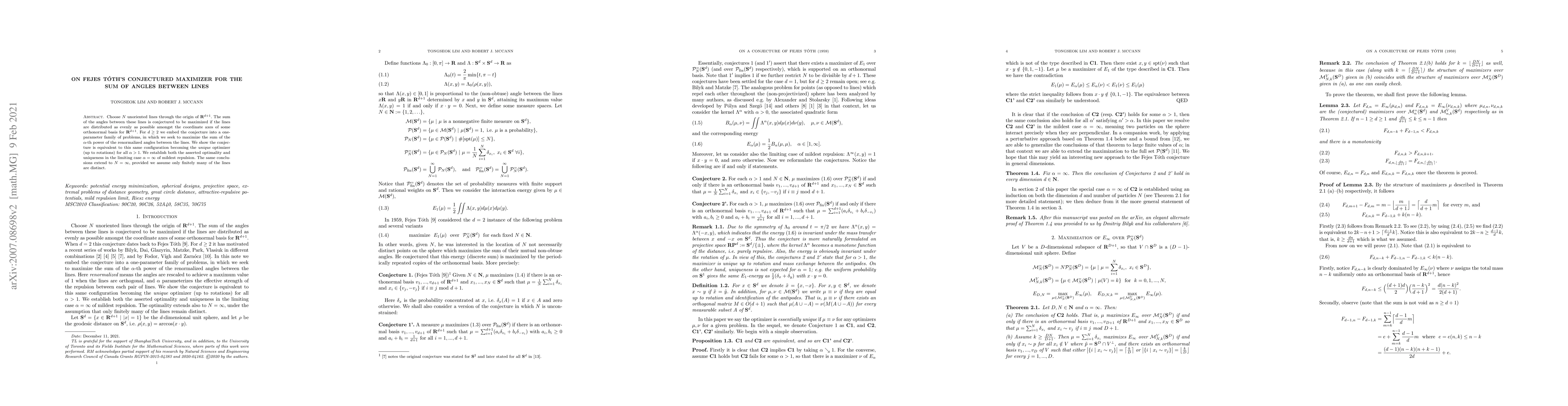 This paper investigates Fejes Tóth's conjecture that the sum of angles between $N$ unoriented lines through the origin in ${\bf R}^{d+1}$ is maximized when the lines align with the coordinate axes of an orthonormal basis. The authors prove that this conjecture holds true and is equivalent to the same configuration being the unique optimizer for all $\alpha > 1$, establishing optimality and uniqueness in the limiting case $\alpha = \infty$.