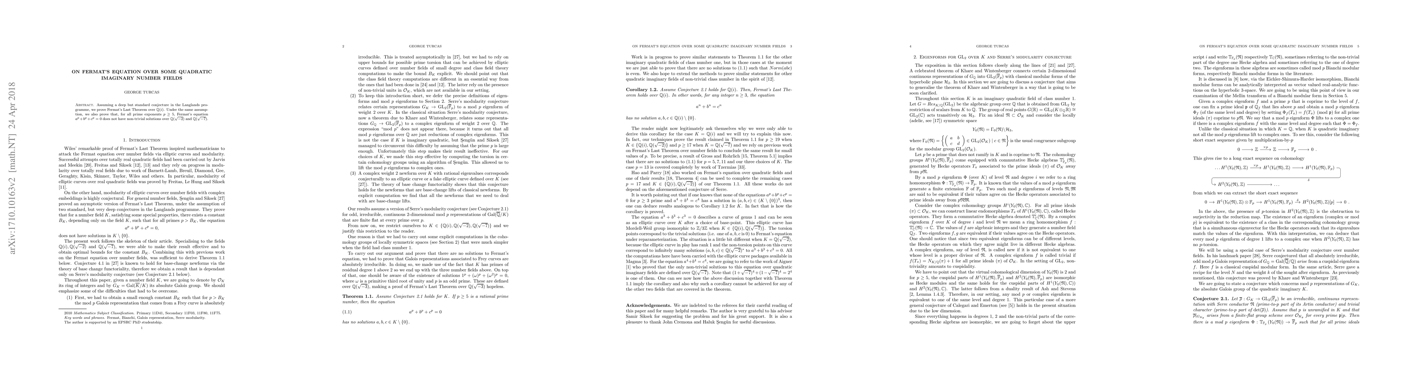 This paper proves Fermat's Last Theorem for $\mathbb Q(i)$ under a conjecture from the Langlands programme. Additionally, it shows that for primes $p \geq 5$, Fermat's equation $a^p+b^p+c^p=0$ has no non-trivial solutions in $\mathbb Q(\sqrt{-2})$ and $\mathbb Q(\sqrt{-7})$.