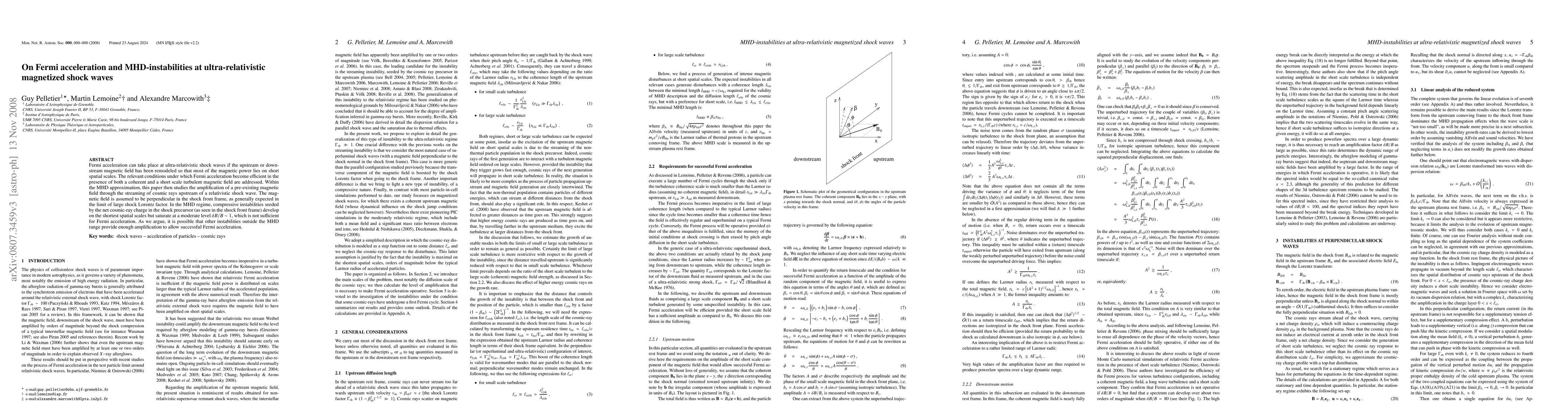 This paper investigates Fermi acceleration at ultra-relativistic magnetized shock waves, focusing on the conditions where magnetic fields are remodeled for efficient acceleration. It finds that while MHD-driven compressive instabilities can amplify magnetic fields, they are insufficient for Fermi acceleration, suggesting other instabilities may be needed.