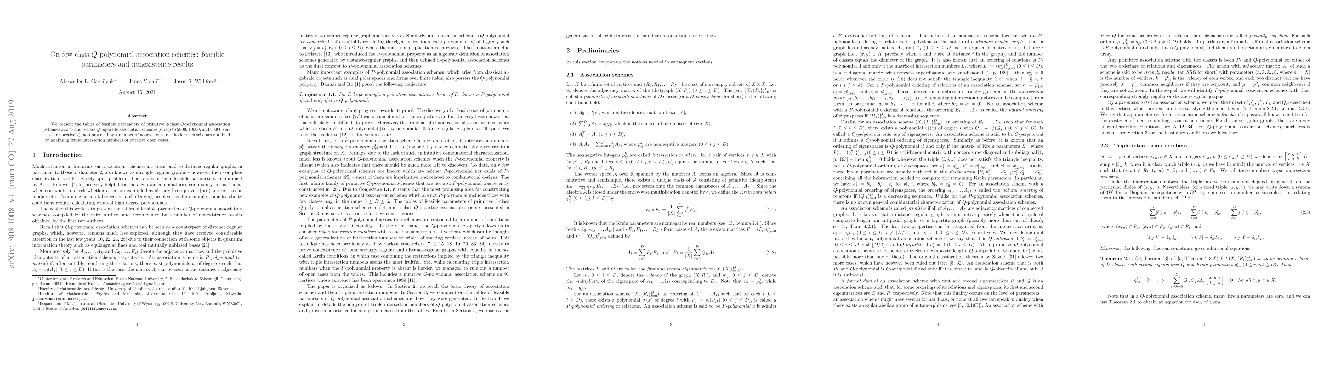 We present the tables of feasible parameters of primitive $3$-class $Q$-polynomial association schemes and $4$- and $5$-class $Q$-bipartite association schemes (on up to $2800$, $10000$, and $50000$ vertices, respectively), accompanied by a number of nonexistence results for such schemes obtained by analysing triple intersection numbers of putative open cases.