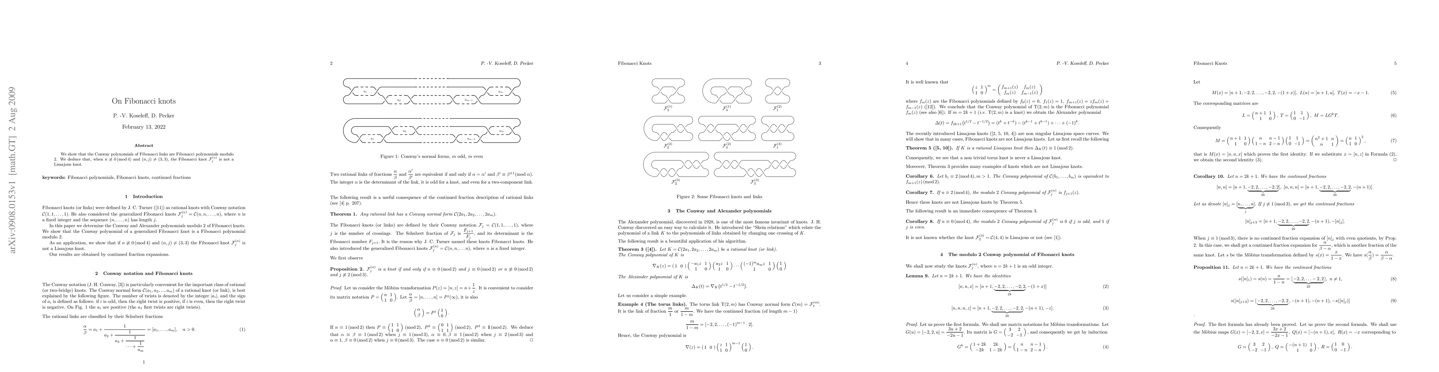 We show that the Conway polynomials of Fibonacci links are Fibonacci polynomials modulo 2. We deduce that, when $ n \not\equiv 0 \Mod 4$ and $(n,j) \neq (3,3),$ the Fibonacci knot $ \cF_j^{(n)} $ is not a Lissajous knot.