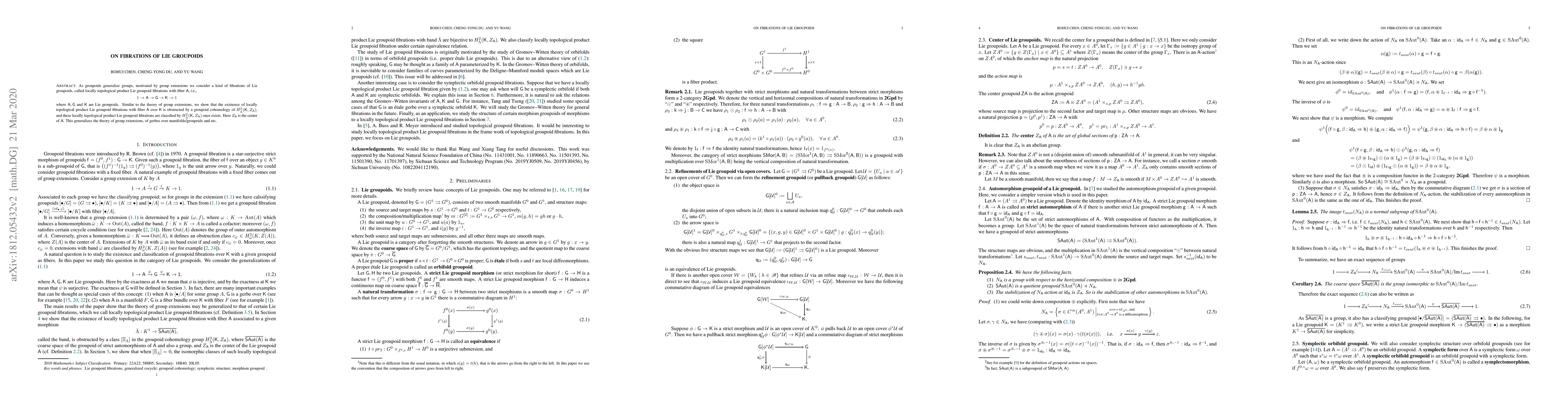 This paper explores the concept of locally topological product Lie groupoid fibrations, extending group extensions to Lie groupoids. It identifies obstructions and classification criteria using groupoid cohomology, generalizing the theory of group extensions and gerbes.