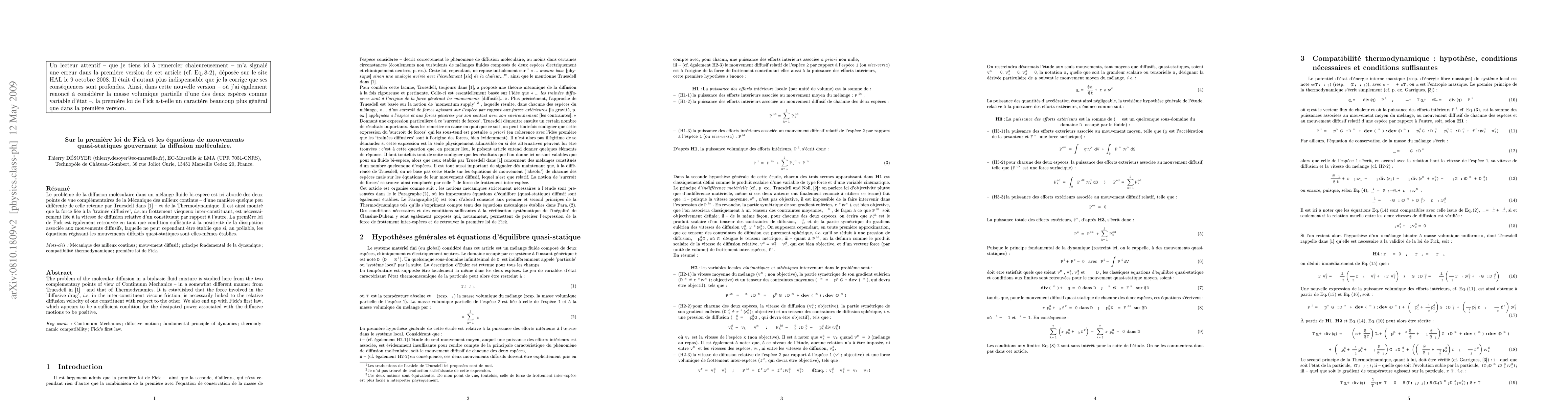 The problem of the molecular diffusion in a biphasic fluid mixture is studied here from the two complementary points of view of Continuum Mechanics - in a somewhat different manner from Truesdell in "Mechanical basis of diffusion" (J. Chem. Physics (U.S.), 37 (1962) 2336-2344) - and that of Thermodynamics. It is established that the force involved in the 'diffusive drag', i.e. in the inter-constituent viscous friction, is necessarily linked to the relative diffusion velocity of one constituent with respect to the other. We also end up with Fick's first law, which appears to be a sufficient condition for the dissipated power associated with the diffusive motions to be positive.