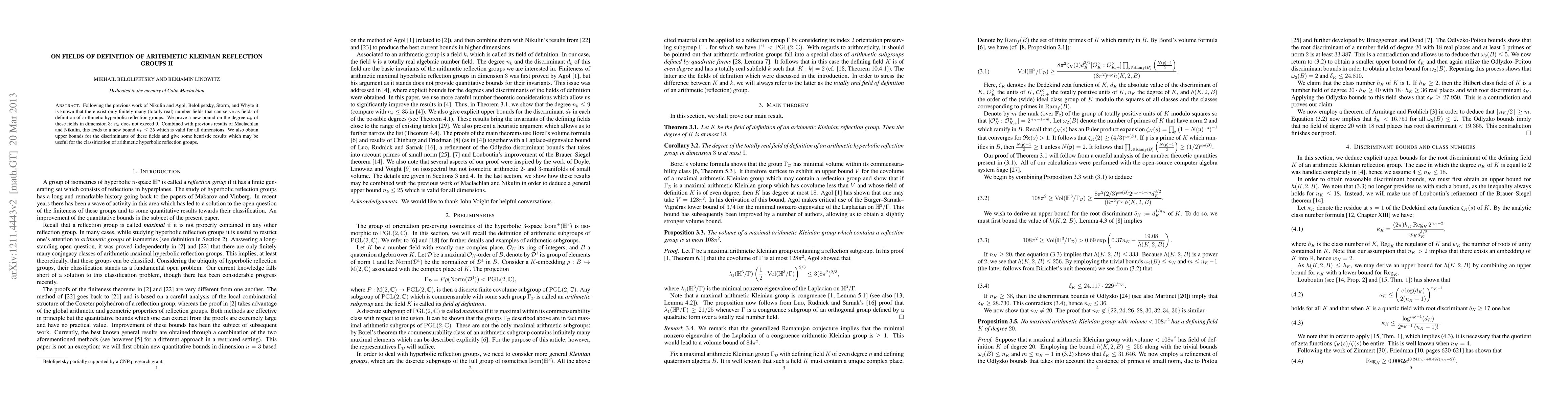 This paper provides a new upper bound of $n_k \le 9$ for the degree of number fields defining arithmetic hyperbolic reflection groups in dimension 3, leading to a combined bound of $n_k \le 25$ for all dimensions. It also establishes upper bounds for the discriminants of these fields and offers heuristic insights for classifying arithmetic hyperbolic reflection groups.
