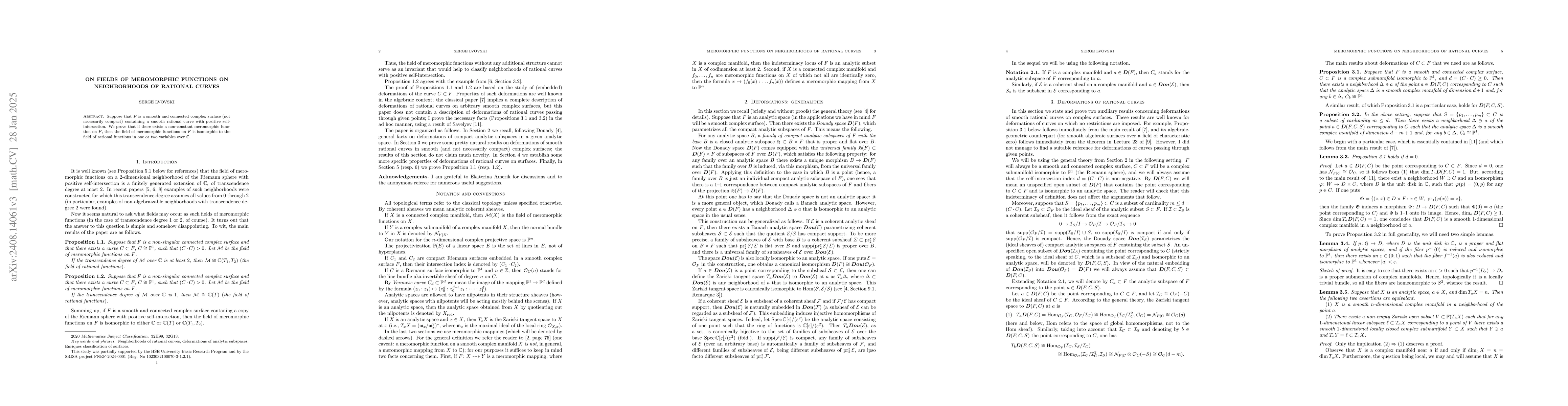 Summary: The paper proves that for a smooth complex surface containing a rational curve, the existence of a non-constant meromorphic function implies the field of meromorphic functions is isomorphic to the field of rational functions in one or two variables over $\mathbb{C}$. This extends the structure of meromorphic functions in such neighborhood settings.