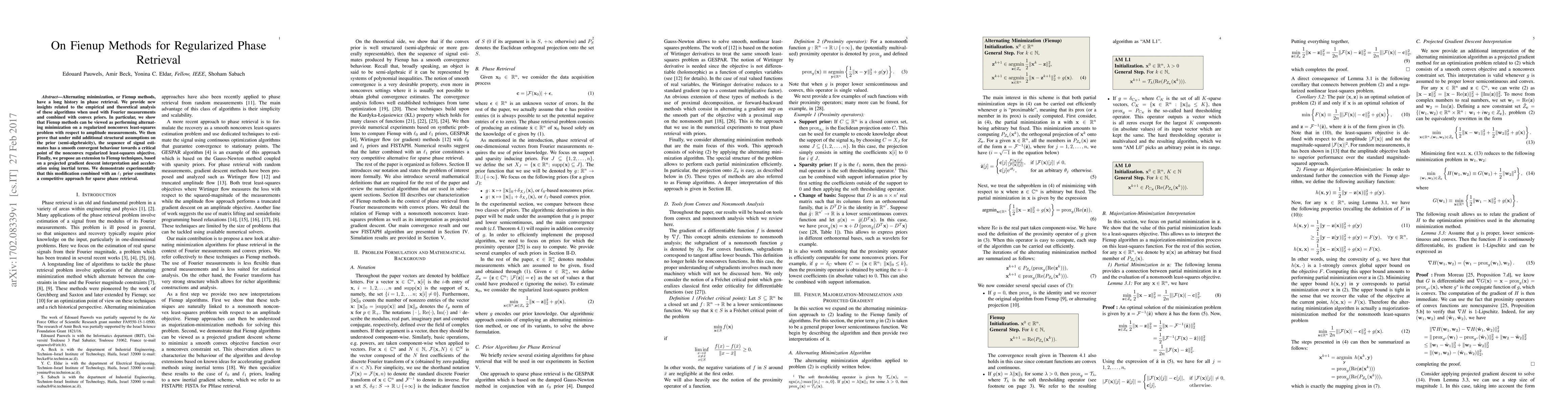 Alternating minimization, or Fienup methods, have a long history in phase retrieval. We provide new insights related to the empirical and theoretical analysis of these algorithms when used with Fourier measurements and combined with convex priors. In particular, we show that Fienup methods can be viewed as performing alternating minimization on a regularized nonconvex least-squares problem with respect to amplitude measurements. We then prove that under mild additional structural assumptions on the prior (semi-algebraicity), the sequence of signal estimates has a smooth convergent behaviour towards a critical point of the nonconvex regularized least-squares objective. Finally, we propose an extension to Fienup techniques, based on a projected gradient descent interpretation and acceleration using inertial terms. We demonstrate experimentally that this modification combined with an $\ell_1$ prior constitutes a competitive approach for sparse phase retrieval.