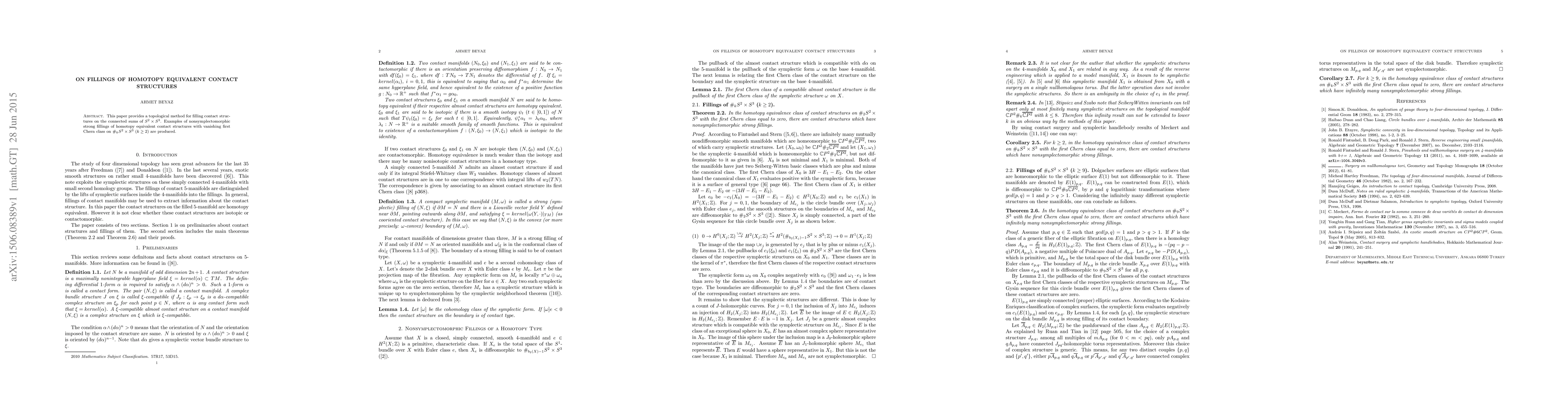 This paper provides a topological method for filling contact structures on the connected sums of $S^2\times S^3$. Examples of nonsymplectomorphic strong fillings of homotopy equivalent contact structures with vanishing first Chern class on $\#_k S^2\times S^3$ $(k\geq2)$ are produced.