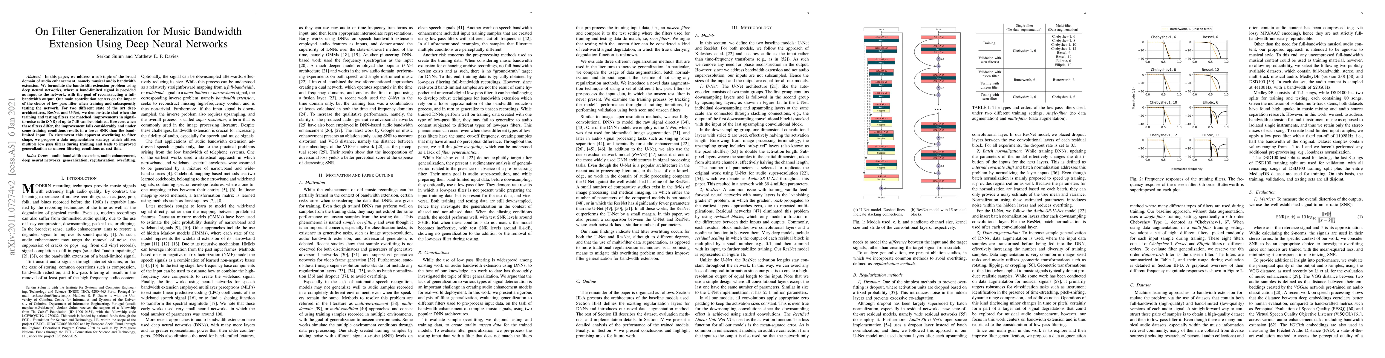 This paper investigates the use of deep neural networks for musical audio bandwidth extension, focusing on the effect of low pass filter choice during training and testing. It finds that matching training and testing filters significantly improves signal-to-noise ratio, but mismatches lead to poor performance. To enhance generalization, the authors propose a data augmentation strategy using multiple filters during training.
