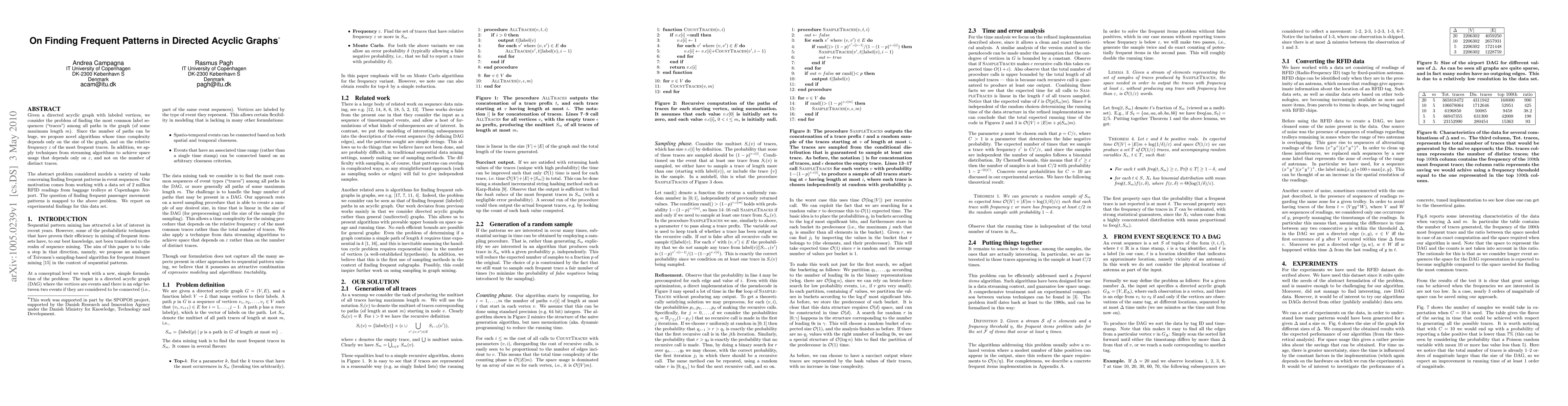 Given a directed acyclic graph with labeled vertices, we consider the problem of finding the most common label sequences ("traces") among all paths in the graph (of some maximum length m). Since the number of paths can be huge, we propose novel algorithms whose time complexity depends only on the size of the graph, and on the relative frequency epsilon of the most frequent traces. In addition, we apply techniques from streaming algorithms to achieve space usage that depends only on epsilon, and not on the number of distinct traces. The abstract problem considered models a variety of tasks concerning finding frequent patterns in event sequences. Our motivation comes from working with a data set of 2 million RFID readings from baggage trolleys at Copenhagen Airport. The question of finding frequent passenger movement patterns is mapped to the above problem. We report on experimental findings for this data set.