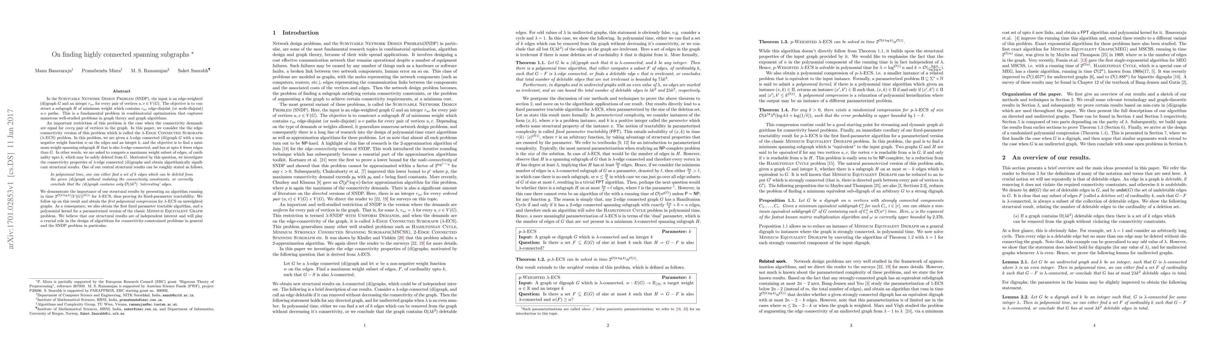 In the Survivable Network Design Problem (SNDP), the input is an edge-weighted (di)graph $G$ and an integer $r_{uv}$ for every pair of vertices $u,v\in V(G)$. The objective is to construct a subgraph $H$ of minimum weight which contains $r_{uv}$ edge-disjoint (or node-disjoint) $u$-$v$ paths. This is a fundamental problem in combinatorial optimization that captures numerous well-studied problems in graph theory and graph algorithms. In this paper, we consider the version of the problem where we are given a $\lambda$-edge connected (di)graph $G$ with a non-negative weight function $w$ on the edges and an integer $k$, and the objective is to find a minimum weight spanning subgraph $H$ that is also $\lambda$-edge connected, and has at least $k$ fewer edges than $G$. In other words, we are asked to compute a maximum weight subset of edges, of cardinality up to $k$, which may be safely deleted from $G$. Motivated by this question, we investigate the connectivity properties of $\lambda$-edge connected (di)graphs and obtain algorithmically significant structural results. We demonstrate the importance of our structural results by presenting an algorithm running in time $2^{O(k \log k)} |V(G)|^{O(1)}$ for $\lambda$-ECS, thus proving its fixed-parameter tractability. We follow up on this result and obtain the {\em first polynomial compression} for $\lambda$-ECS on unweighted graphs. As a consequence, we also obtain the first fixed parameter tractable algorithm, and a polynomial kernel for a parameterized version of the classic Mininum Equivalent Graph problem. We believe that our structural results are of independent interest and will play a crucial role in the design of algorithms for connectivity-constrained problems in general and the SNDP problem in particular.