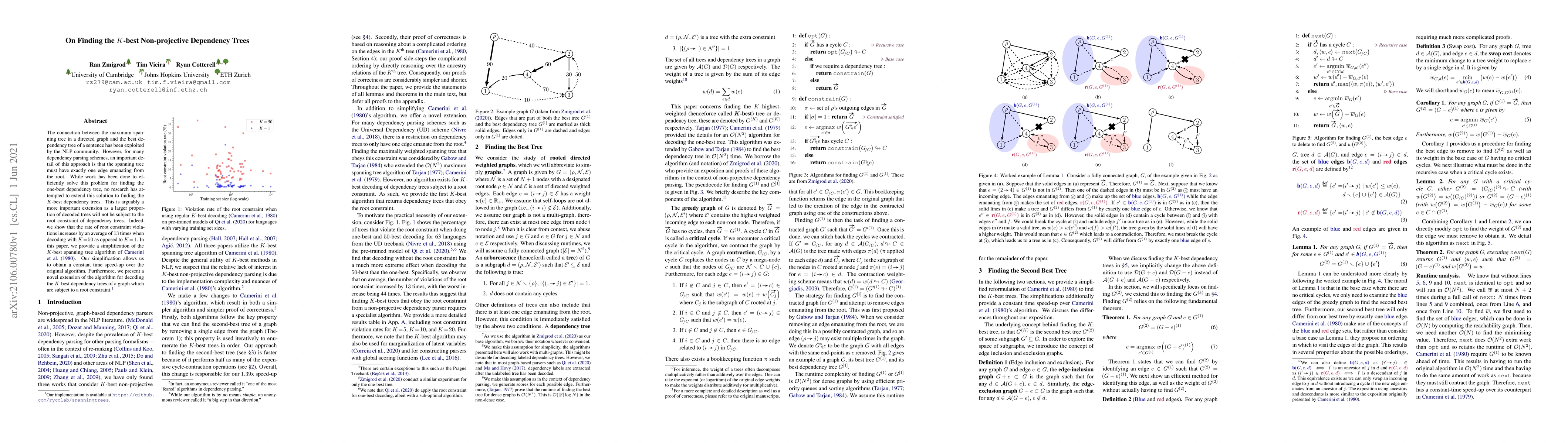 This paper simplifies the $K$-best spanning tree algorithm to efficiently find the $K$-best non-projective dependency trees, which are subject to a root constraint. The authors demonstrate a significant increase in root constraint violations with larger $K$ values and provide a constant time speed-up over the original algorithm.