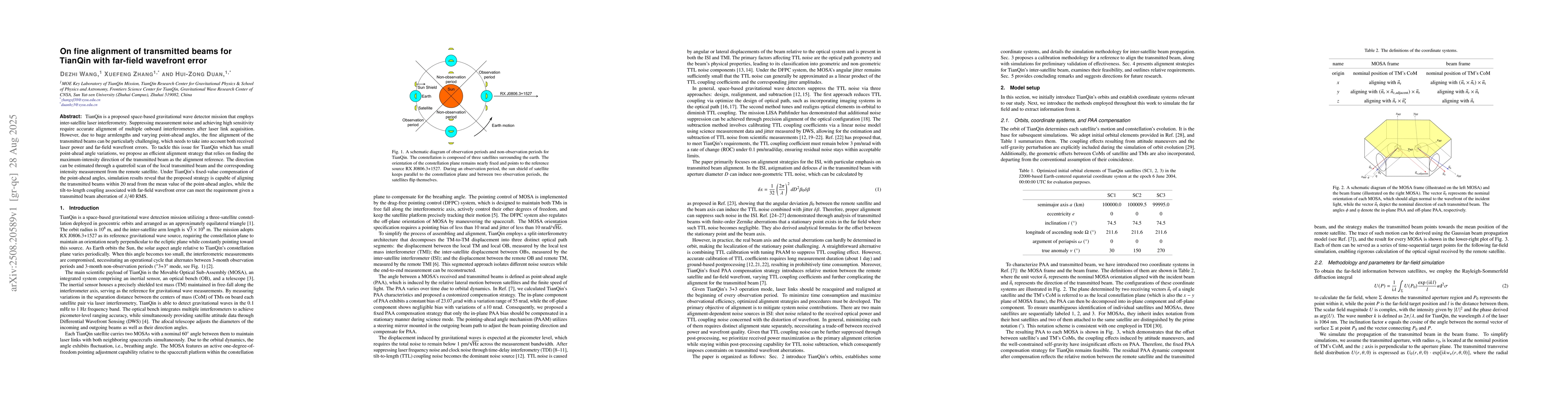 TianQin is a proposed space-based gravitational wave detector mission that employs inter-satellite laser interferometry. Suppressing measurement noise and achieving high sensitivity require accurate alignment of multiple onboard interferometers after laser link acquisition. However, due to huge armlengths and varying point-ahead angles, the fine alignment of the transmitted beams can be particularly challenging, which needs to take into account both received laser power and far-field wavefront errors. To tackle this issue for TianQin which has small point-ahead angle variations, we propose an efficient alignment strategy that relies on finding the maximum-intensity direction of the transmitted beam as the alignment reference. The direction can be estimated through a quatrefoil scan of the local transmitted beam and the corresponding intensity measurement from the remote satellite. Under TianQin's fixed-value compensation of the point-ahead angles, simulation results reveal that the proposed strategy is capable of aligning the transmitted beams within 20 nrad from the mean value of the point-ahead angles, while the tilt-to-length coupling associated with far-field wavefront error can meet the requirement given a transmitted beam aberration of $\lambda/40$ RMS.