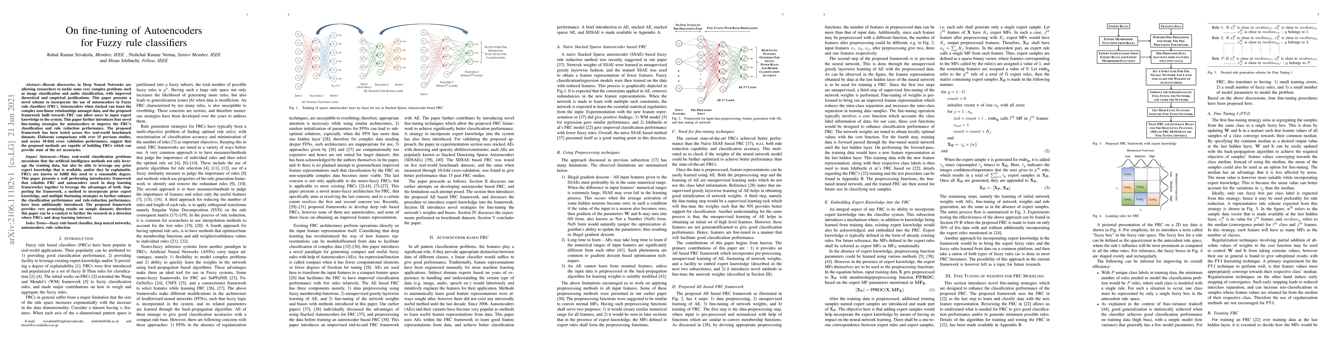 Recent discoveries in Deep Neural Networks are allowing researchers to tackle some very complex problems such as image classification and audio classification, with improved theoretical and empirical justifications. This paper presents a novel scheme to incorporate the use of autoencoders in Fuzzy rule classifiers (FRC). Autoencoders when stacked can learn the complex non-linear relationships amongst data, and the proposed framework built towards FRC can allow users to input expert knowledge to the system. This paper further introduces four novel fine-tuning strategies for autoencoders to improve the FRC's classification and rule reduction performance. The proposed framework has been tested across five real-world benchmark datasets. Elaborate comparisons with over 15 previous studies, and across 10-fold cross validation performance, suggest that the proposed methods are capable of building FRCs which can provide state of the art accuracies.