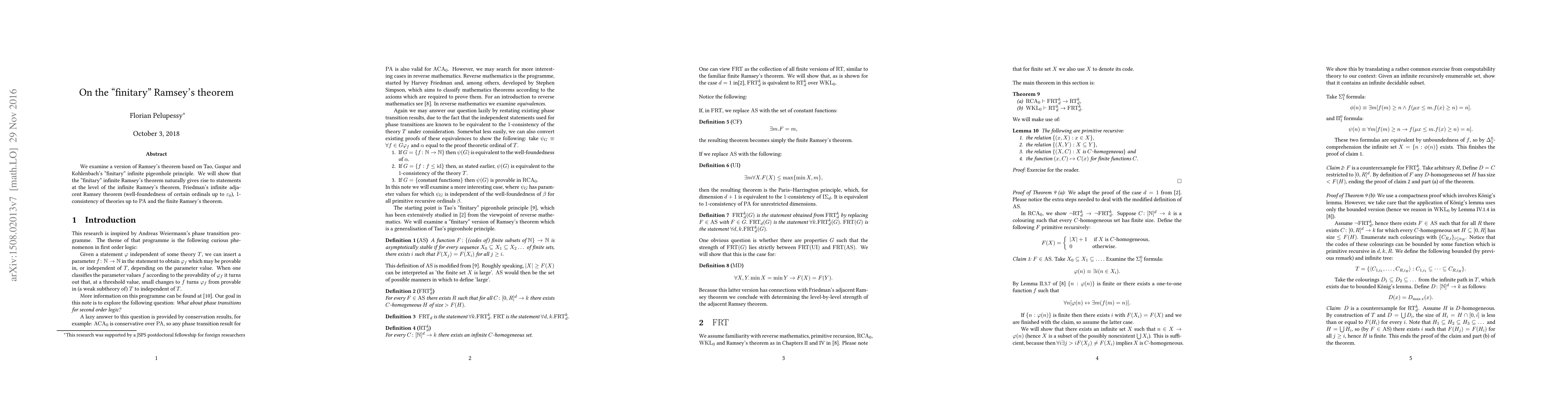 This paper explores a "finitary" version of Ramsey's theorem derived from the infinite pigeonhole principle, demonstrating its equivalence to the infinite Ramsey's theorem, Friedman's adjacent Ramsey theorem, $1$-consistency of theories up to PA, and the finite Ramsey's theorem.