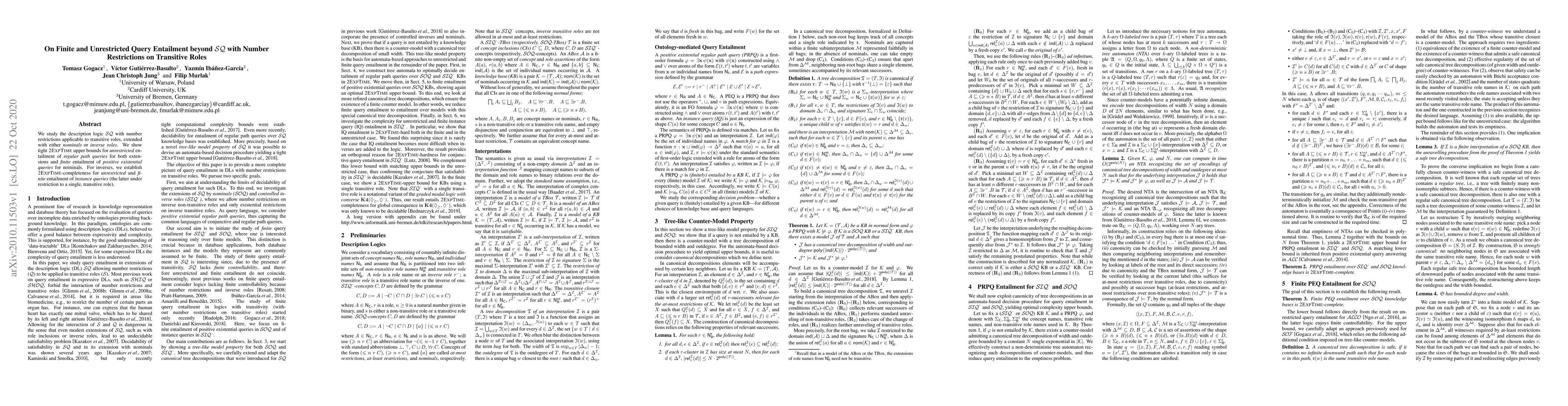 This paper explores the entailment complexities in the extended description logic SQ with number restrictions on transitive roles, incorporating either nominals or inverse roles. It establishes tight 2EXPTIME upper bounds for both unrestricted and finite entailment of queries in these extensions.