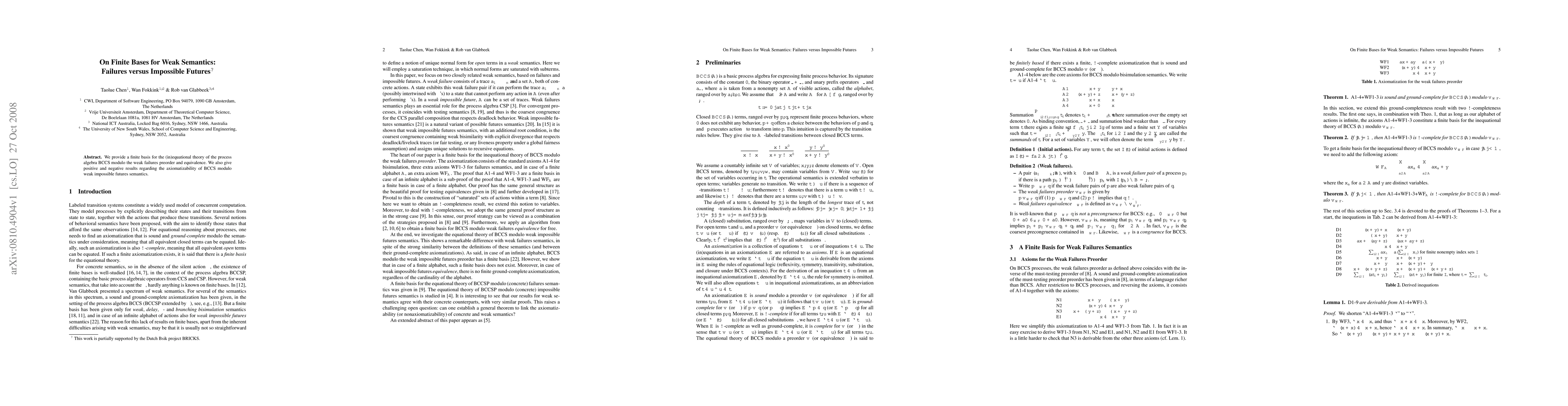 We provide a finite basis for the (in)equational theory of the process algebra BCCS modulo the weak failures preorder and equivalence. We also give positive and negative results regarding the axiomatizability of BCCS modulo weak impossible futures semantics.