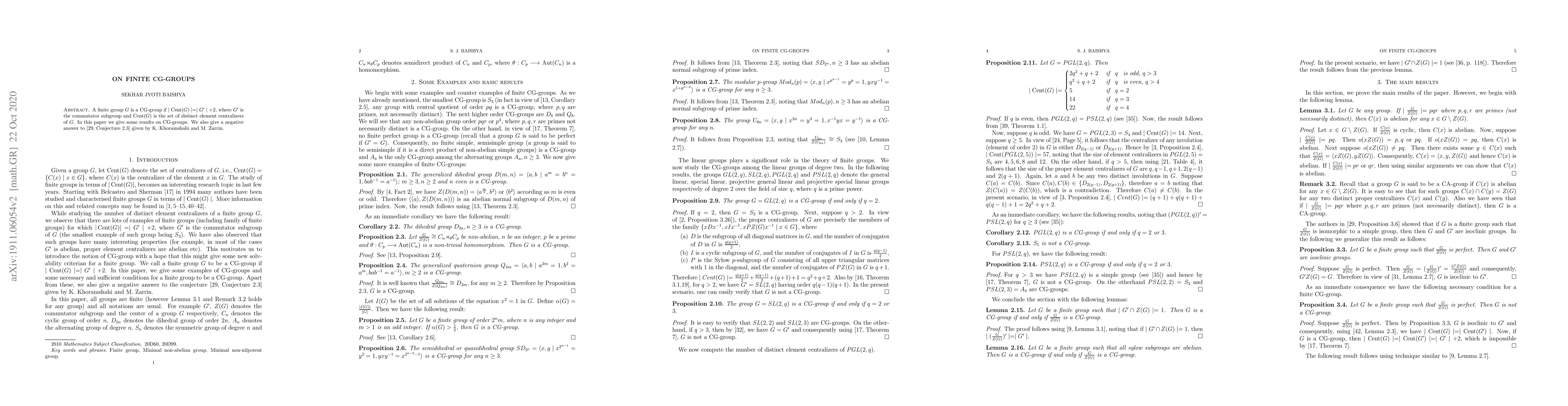 A finite group $G$ is a CG-group if $|{\rm Cent}(G) | = | G' |+2$, where $G'$ is the commutator subgroup and Cent$(G)$ is the set of distinct element centralizers of $G$. In this paper we give some results on CG-groups. We also give a negative answer to \cite[Conjecture 2.3]{con} given by K. Khoramshahi and M. Zarrin.