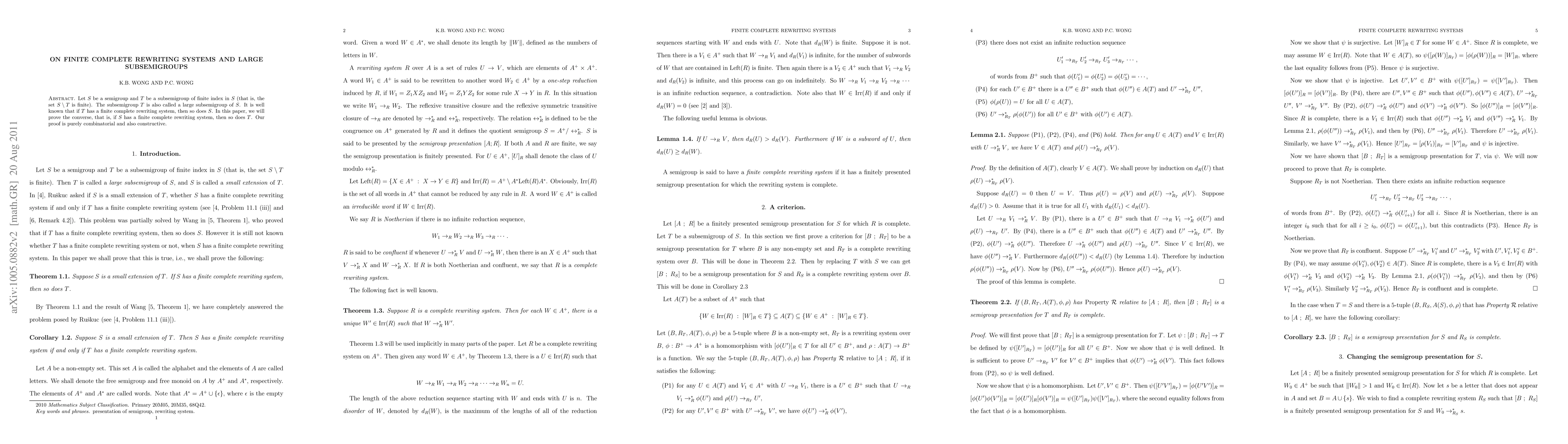 Let $S$ be a semigroup and $T$ be a subsemigroup of finite index in $S$ (that is, the set $S\setminus T$ is finite). The subsemigroup $T$ is also called a large subsemigroup of $S$. It is well known that if $T$ has a finite complete rewriting system then so does $S$. In this paper, we will prove the converse, that is, if $S$ has a finite complete rewriting system then so does $T$. Our proof is purely combinatorial and also constructive.