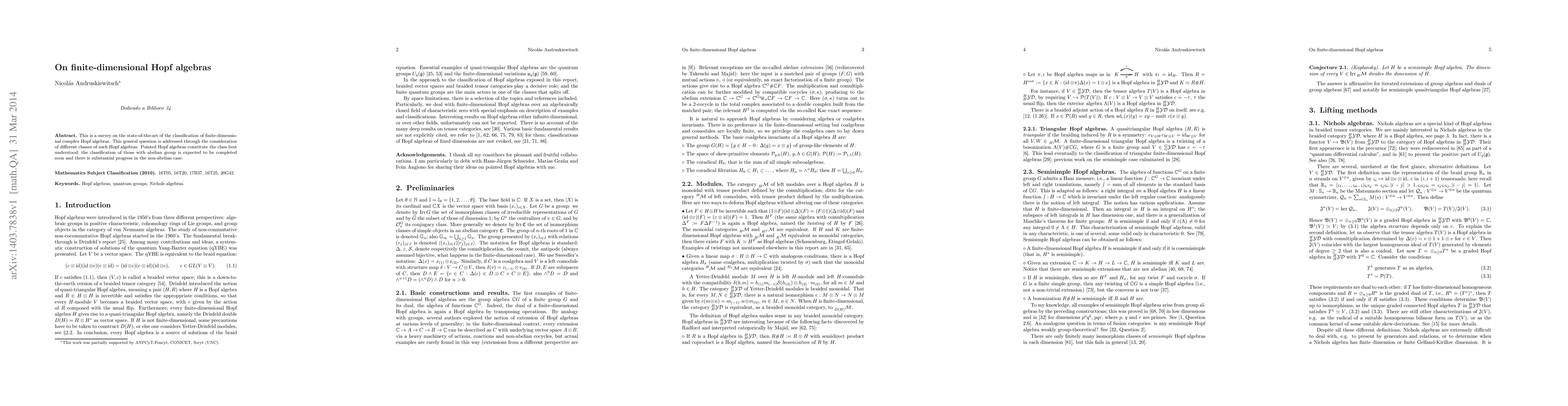 This is a survey on the state-of-the-art of the classification of finite-dimensional complex Hopf algebras. This general question is addressed through the consideration of different classes of such Hopf algebras. Pointed Hopf algebras constitute the class best understood; the classification of those with abelian group is expected to be completed soon and there is substantial progress in the non-abelian case.