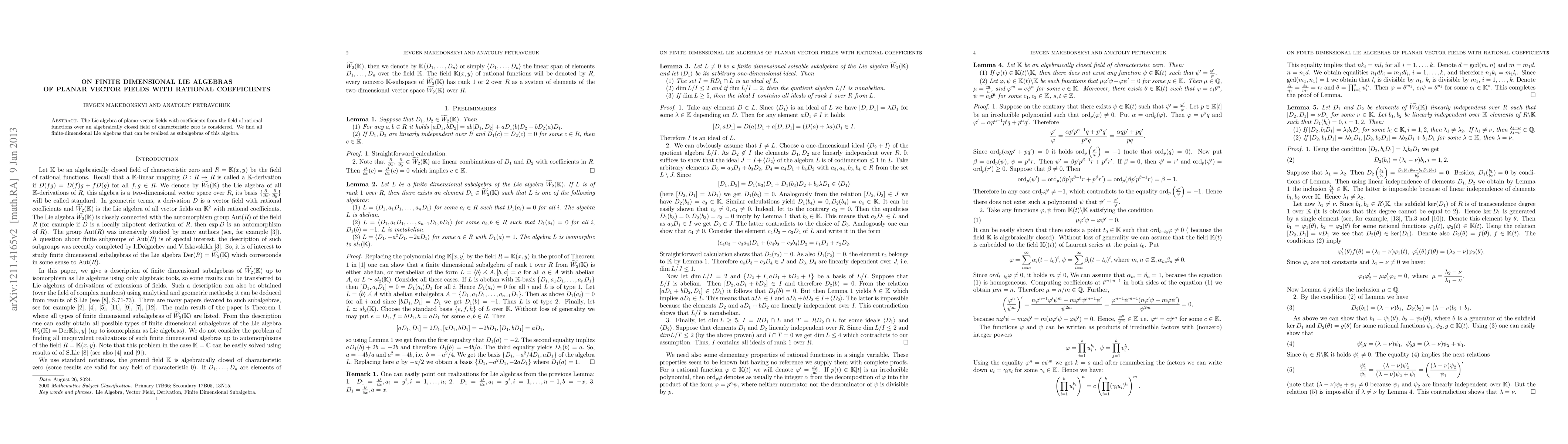 This paper investigates finite-dimensional Lie algebras of planar vector fields with rational coefficients, identifying those that can be realized as subalgebras in a larger algebra.