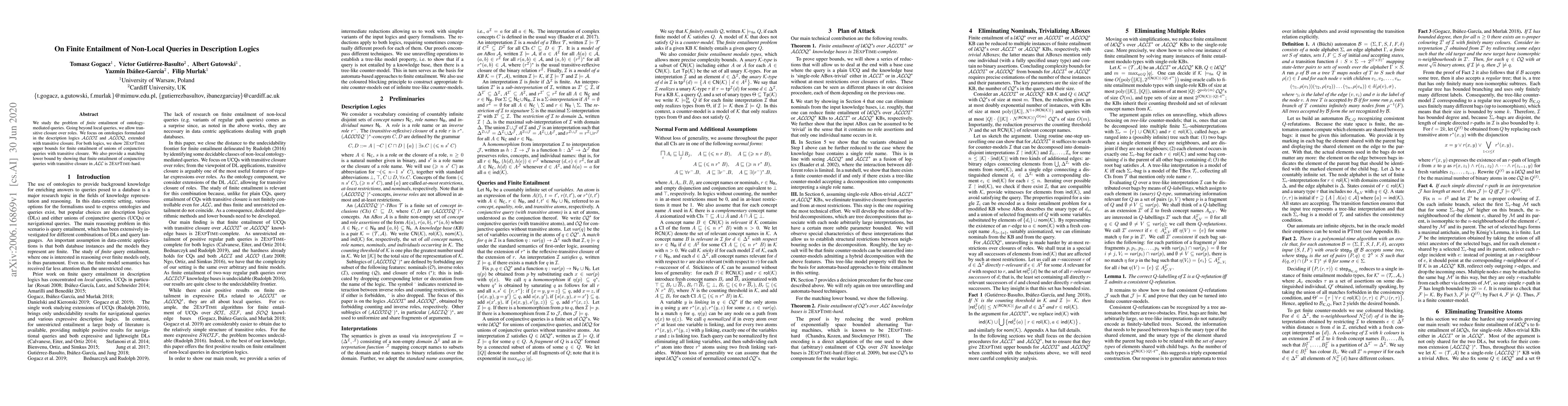 This paper investigates the finite entailment of non-local queries in extended ALCOI and ALCOQ description logics, demonstrating 2EXPTIME upper bounds for such queries and proving a matching lower bound, establishing 2EXPTIME-hardness for conjunctive queries with transitive closure.