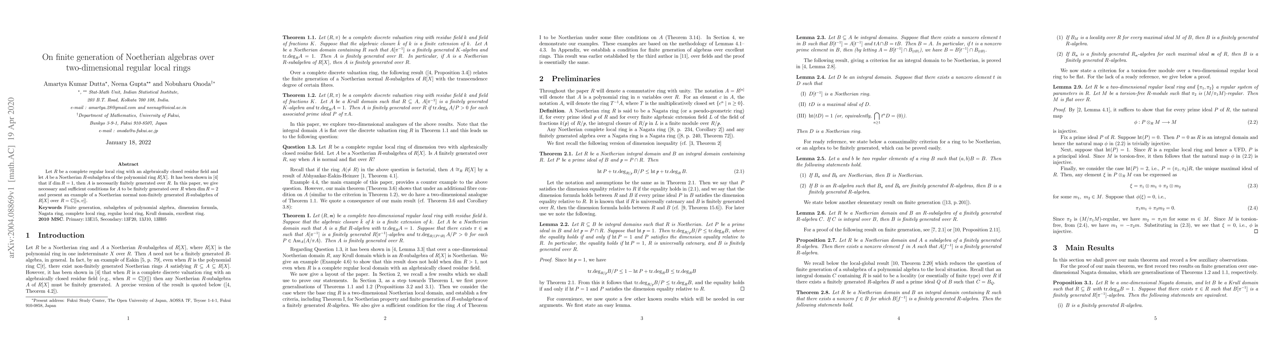 This paper investigates the finite generation of Noetherian subalgebras $A$ of the polynomial ring $R[X]$ over a complete two-dimensional regular local ring $R$ with an algebraically closed residue field. It provides necessary and sufficient conditions for $A$ to be finitely generated and presents a counterexample of a Noetherian normal $R$-subalgebra that is not finitely generated.
