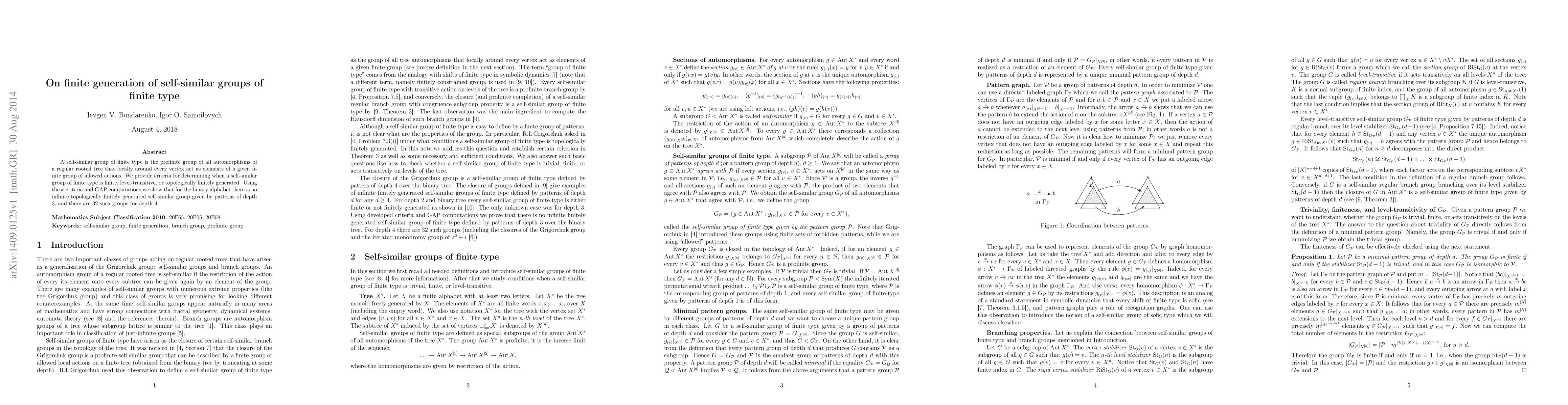 A self-similar group of finite type is the profinite group of all automorphisms of a regular rooted tree that locally around every vertex act as elements of a given finite group of allowed actions. We provide criteria for determining when a self-similar group of finite type is finite, level-transitive, or topologically finitely generated. Using these criteria and GAP computations we show that for the binary alphabet there is no infinite topologically finitely generated self-similar group given by patterns of depth $3$, and there are $32$ such groups for depth $4$.
