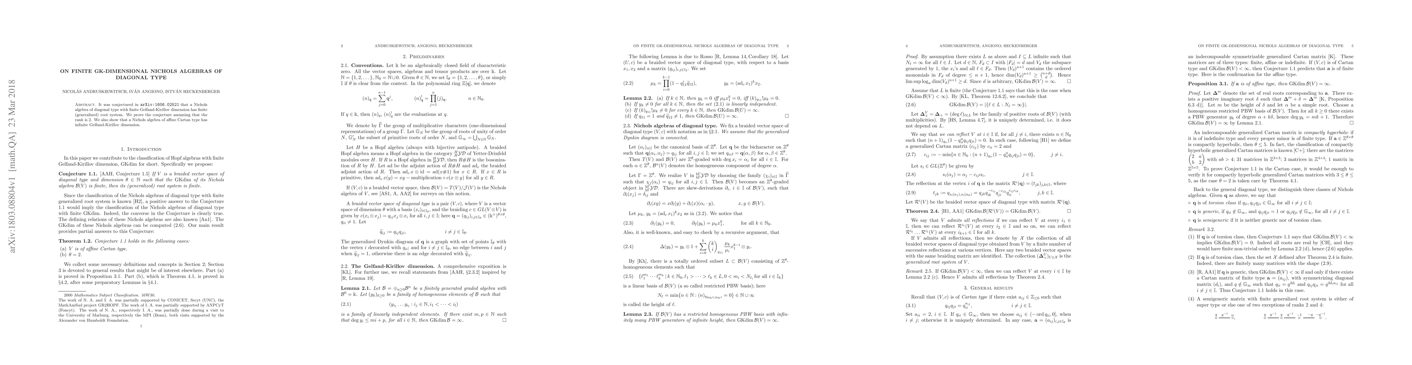This paper proves the conjecture that Nichols algebras of diagonal type with finite Gelfand-Kirillov dimension have finite generalized root systems when the rank is 2. Additionally, it demonstrates that Nichols algebras of affine Cartan type have infinite Gelfand-Kirillov dimension.