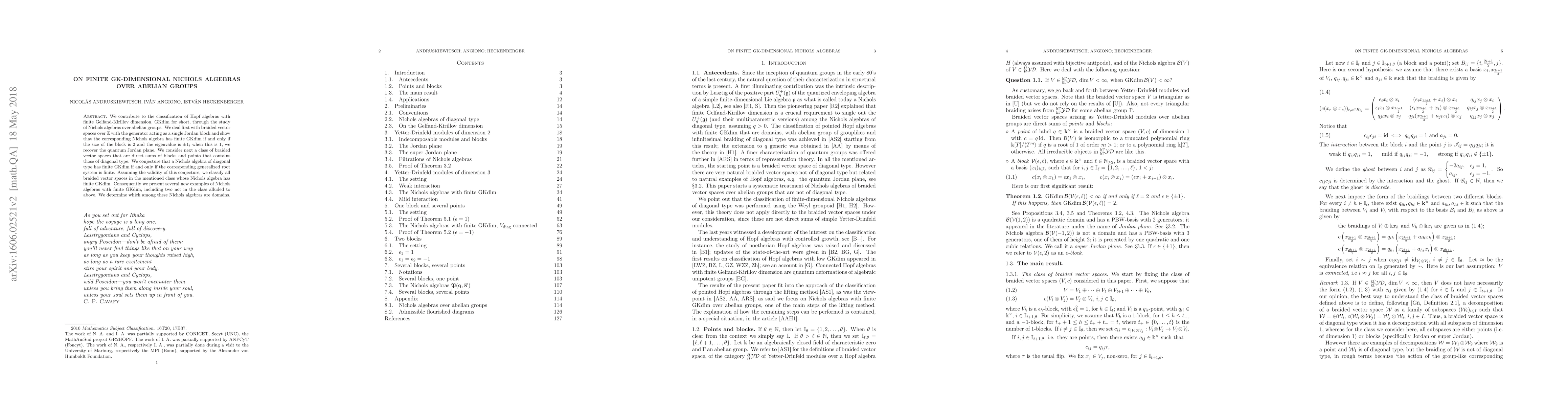 This paper classifies Nichols algebras over abelian groups with finite Gelfand-Kirillov dimension, showing that certain braided vector spaces have finite GK dimension only under specific conditions, leading to new examples of such algebras and determining which are domains.
