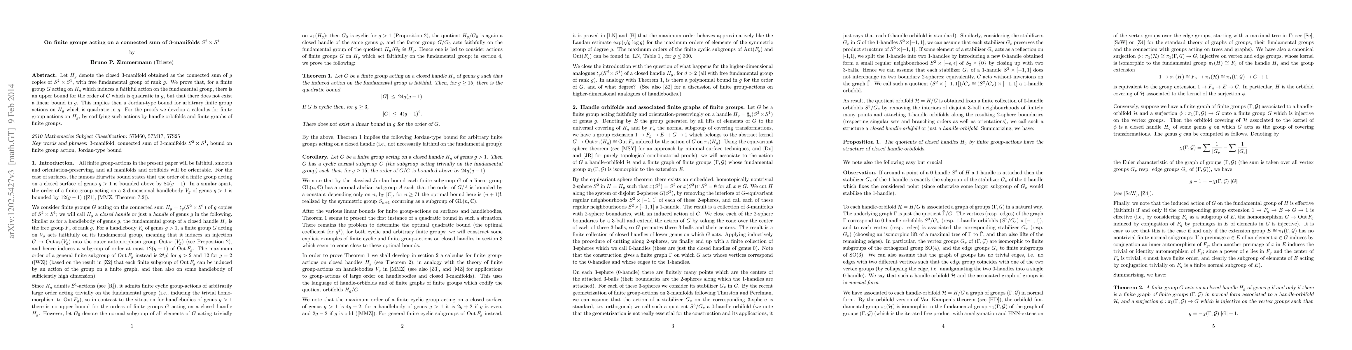 Let H_g denote the closed 3-manifold obtained as the connected sum of g copies of S^2 times S^1, with free fundamental group of rank g. We prove that, for a finite group G acting on H_g which induces a faithful action on the fundamental group, there is an upper bound for the order of G which is quadratic in g, but that there does not exist a linear bound in g. This implies then a Jordan-type bound for arbitrary finite group actions on H_g which is quadratic in g. For the proofs we develop a calculus for finite group-actions on H_g, by codifying such actions by handle-orbifolds and finite graphs of finite groups.