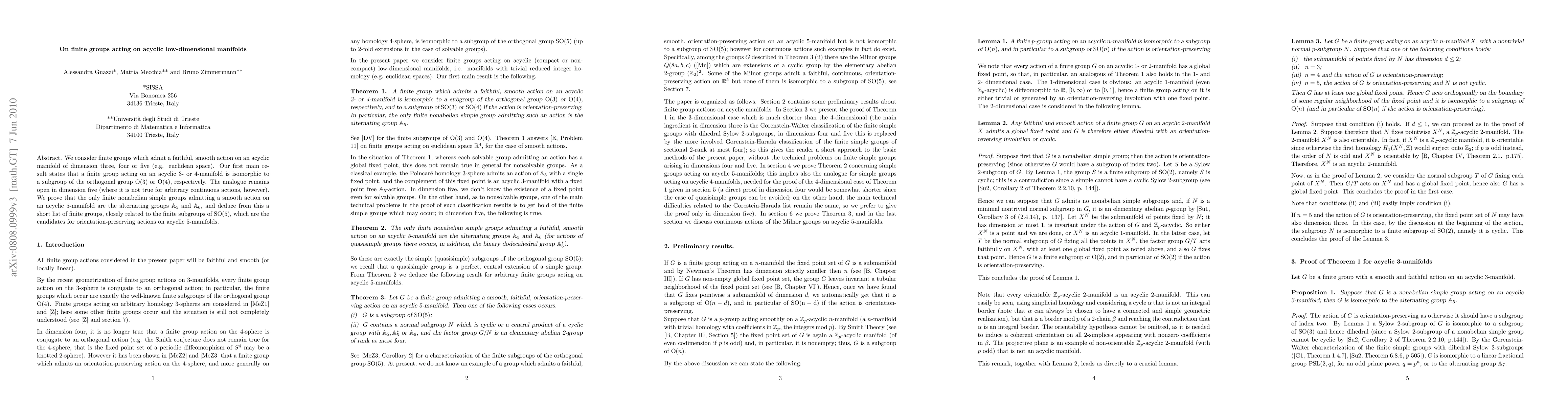 Summary: This paper investigates finite groups with faithful smooth actions on acyclic manifolds of dimensions three to five, proving that such groups in dimensions three and four are isomorphic to subgroups of O(3) and O(4) respectively. For dimension five, it identifies A_5 and A_6 as the only nonabelian simple groups admitting such actions, leading to a specific list of related finite groups acting on acyclic 5-manifolds.