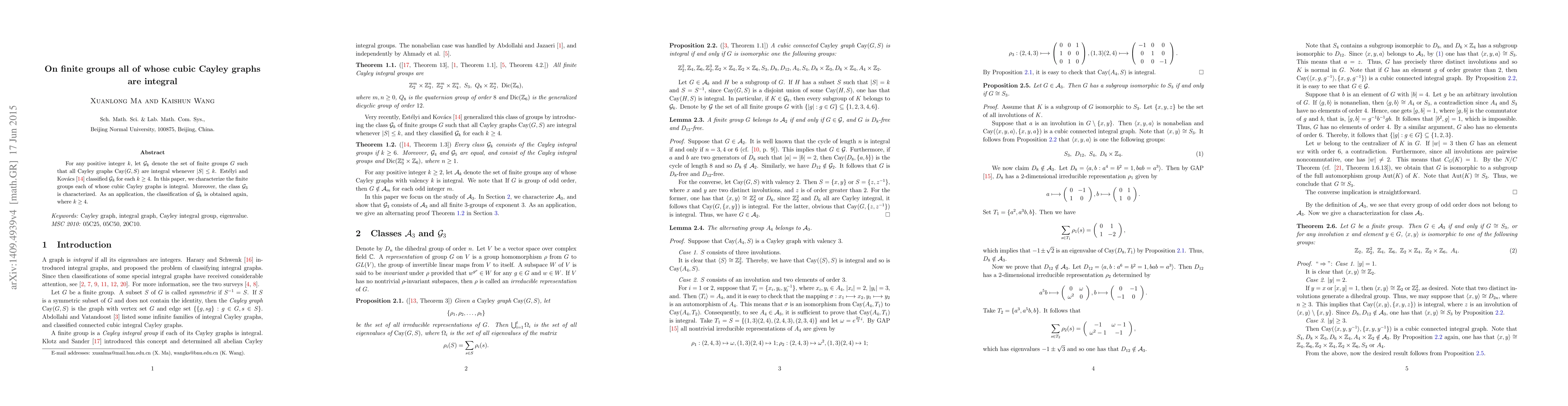 For any positive integer $k$, let $\mathcal{G}_k$ denote the set of finite groups $G$ such that all Cayley graphs ${\rm Cay}(G,S)$ are integral whenever $|S|\le k$. Est${\rm \acute{e}}$lyi and Kov${\rm \acute{a}}$cs \cite{EK14} classified $\mathcal{G}_k$ for each $k\ge 4$. In this paper, we characterize the finite groups each of whose cubic Cayley graphs is integral. Moreover, the class $\mathcal{G}_3$ is characterized. As an application, the classification of $\mathcal{G}_k$ is obtained again, where $k\ge 4$.