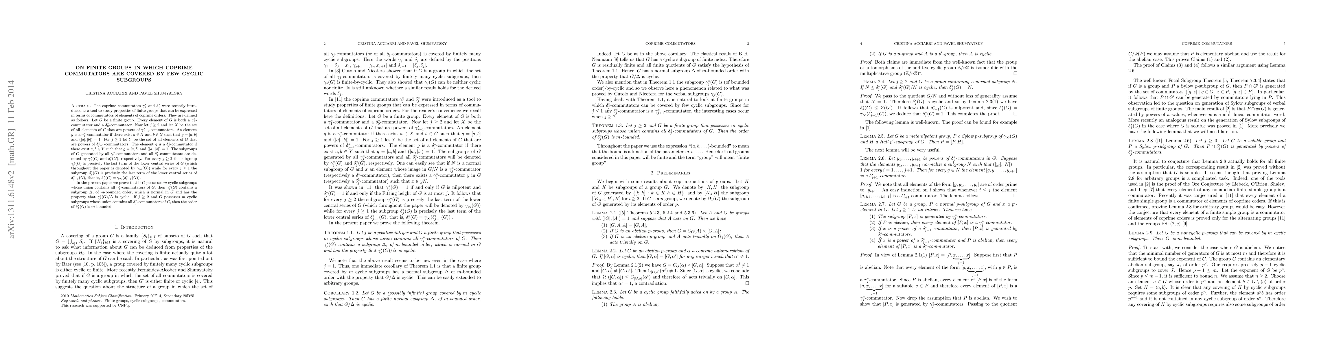 The paper explores the properties of finite groups defined by coprime commutators, introducing $\gamma_j^*$ and $\delta_j^*$ commutators. It proves that if $G$ has $m$ cyclic subgroups covering all $\gamma_j^*$-commutators, then $\gamma_j^*(G)$ contains a normal subgroup of $m$-bounded order, making $\gamma_j^*(G)/\Delta$ cyclic; similarly, if $G$ covers $\delta_j^*$-commutators with $m$ cyclic subgroups, $\delta_j^*(G)$ has $m$-bounded order.
