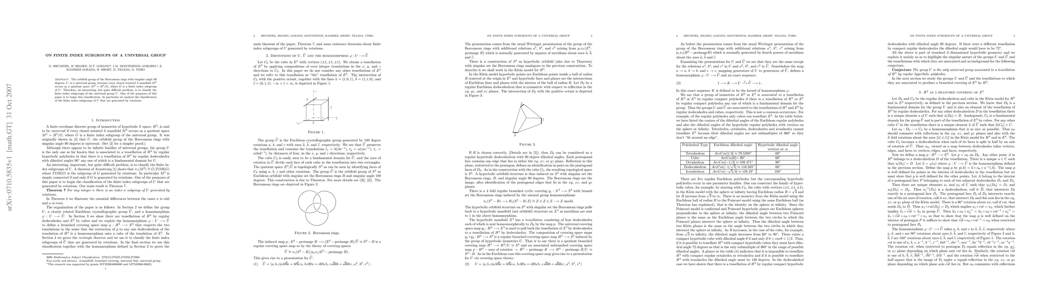 The orbifold group of the Borromean rings with singular angle 90 degrees, $U$, is a universal group, because every closed oriented 3--manifold $M^{3}$ occurs as a quotient space $M^{3} = H^{3}/G$, where $G$ is a finite index subgroup of $U$. Therefore, an interesting, but quite difficult problem, is to classify the finite index subgroups of the universal group $U$. One of the purposes of this paper is to begin this classification. In particular we analyze the classification of the finite index subgroups of $U$ that are generated by rotations.