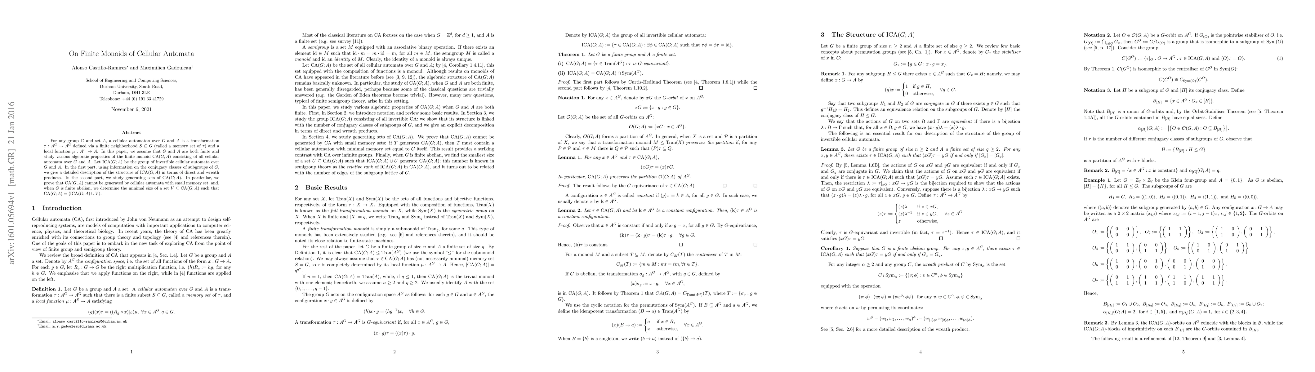 This paper explores algebraic properties of finite monoids of cellular automata over finite groups and sets, focusing on the structure of invertible cellular automata and the generation of the monoid by cellular automata with small memory sets. It reveals that the monoid cannot be generated by automata with small memory and determines the minimal size of a generating set when the group is finite abelian.